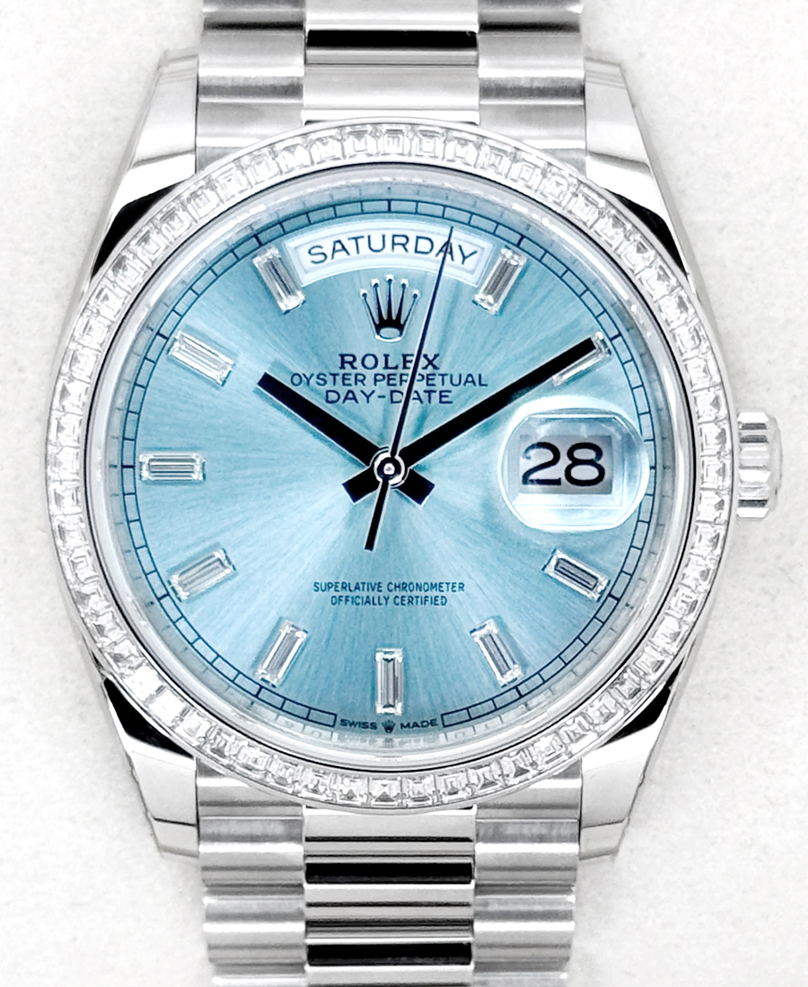 롤렉스 데이데이트 36 128396TBR 아이스 블루 바게트 베젤 다이아