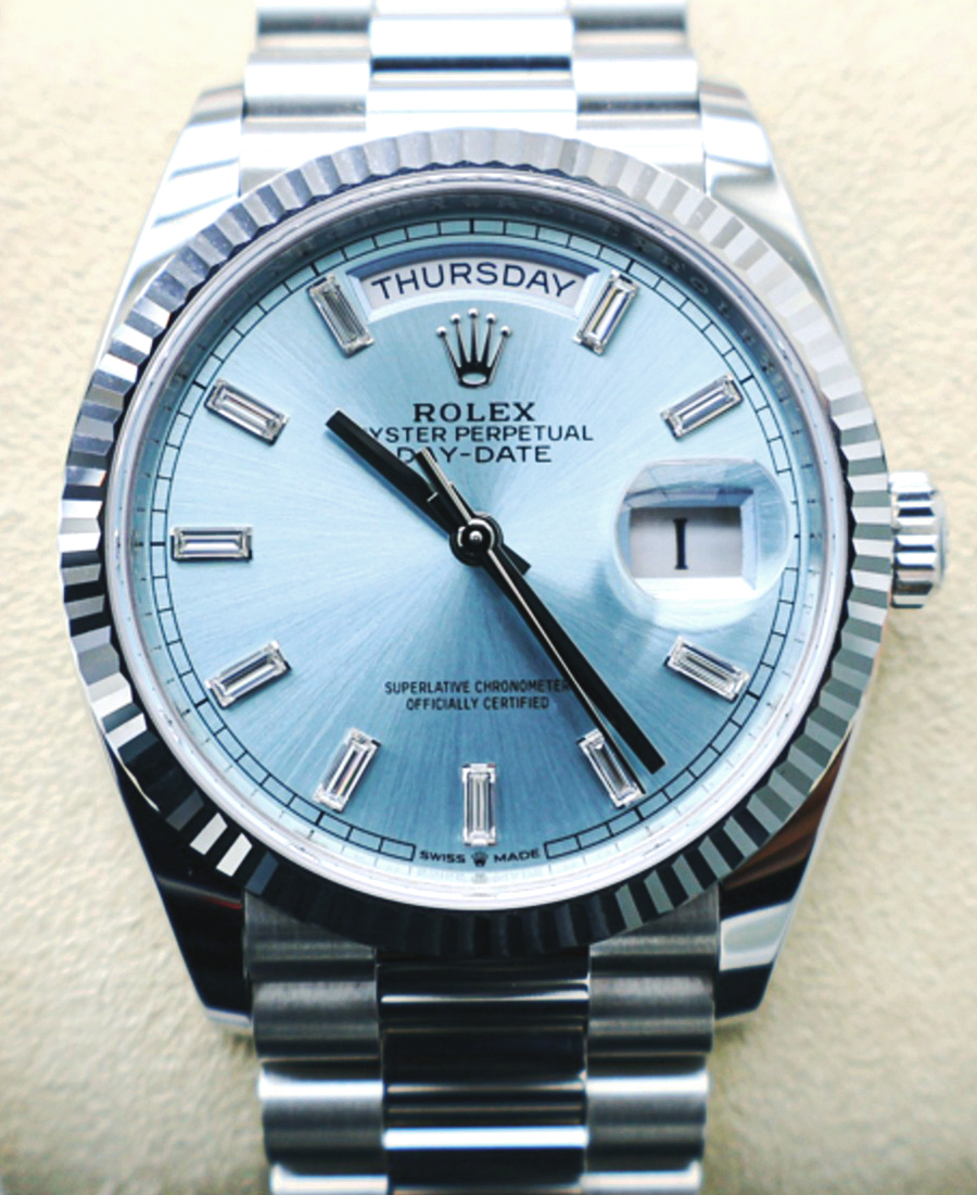 롤렉스 데이데이트 36 128236 아이스 블루 바게트 다이아
