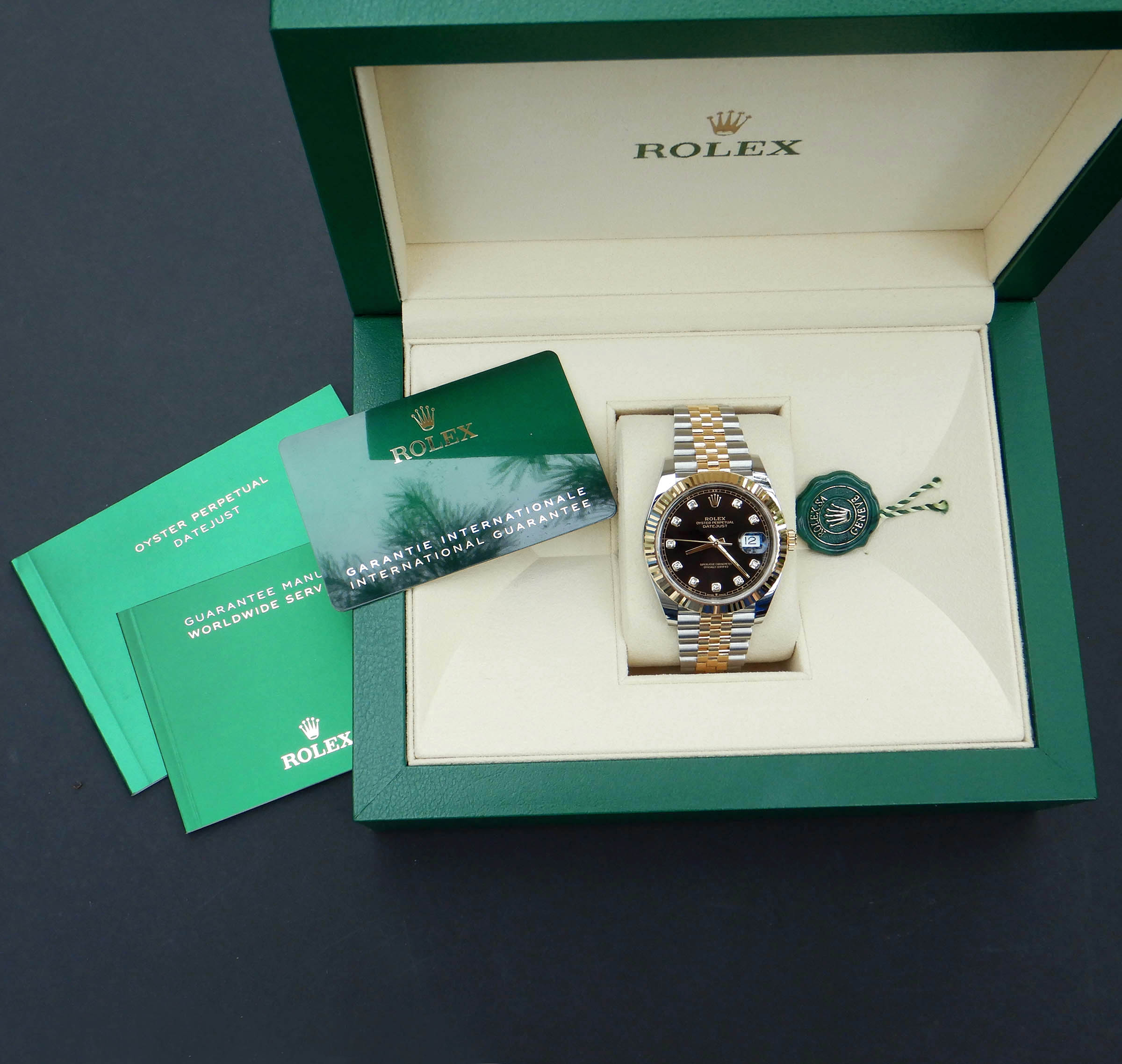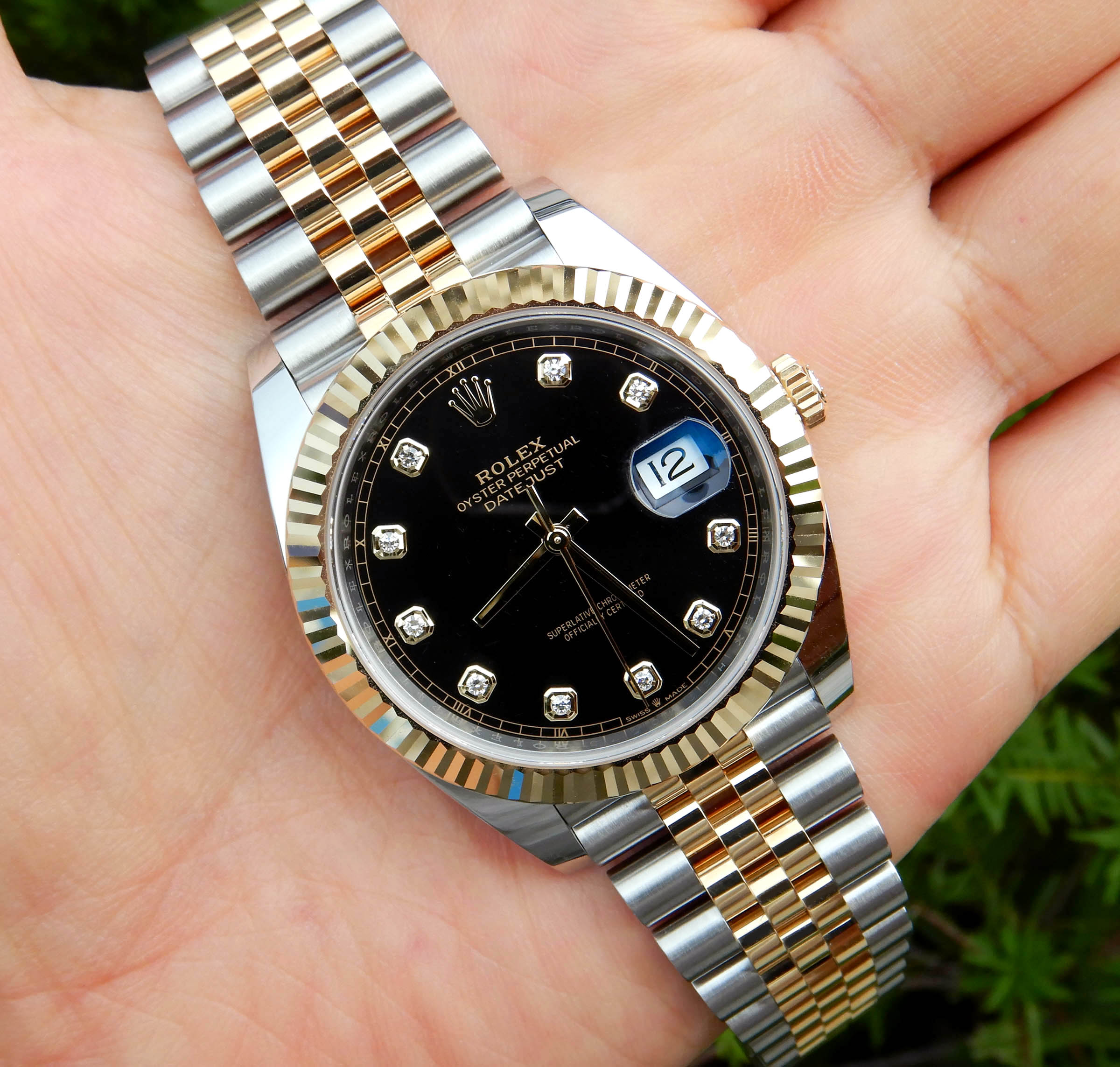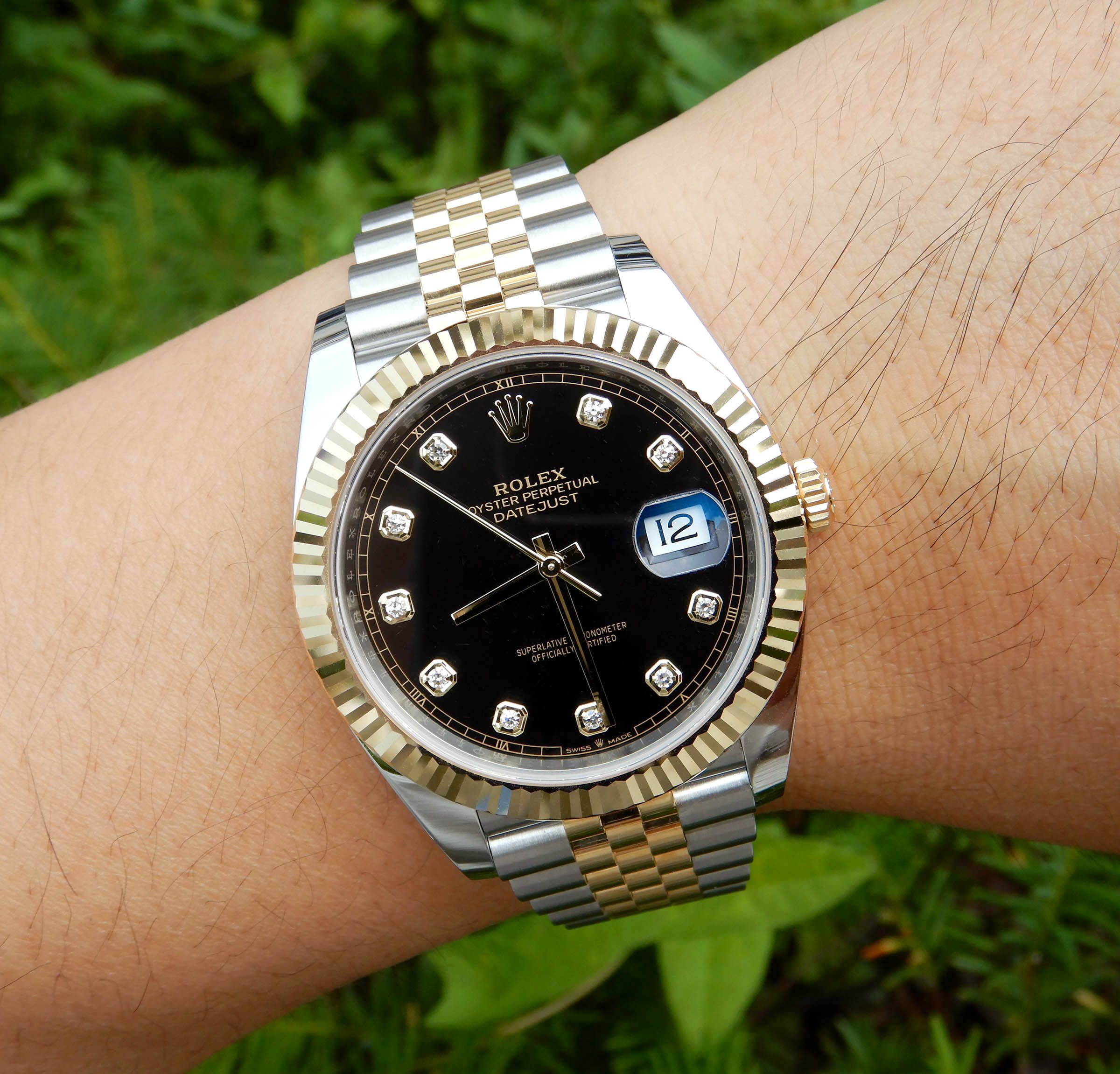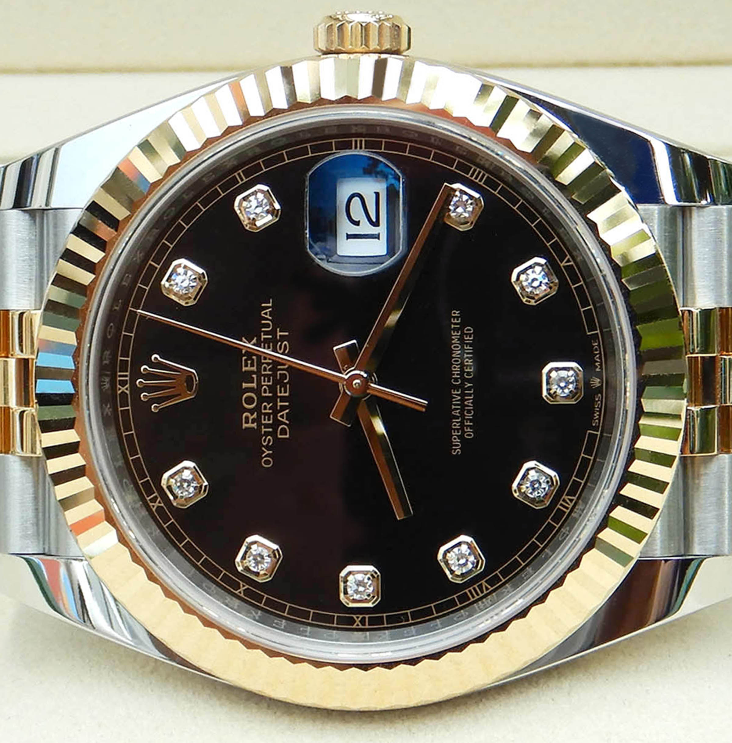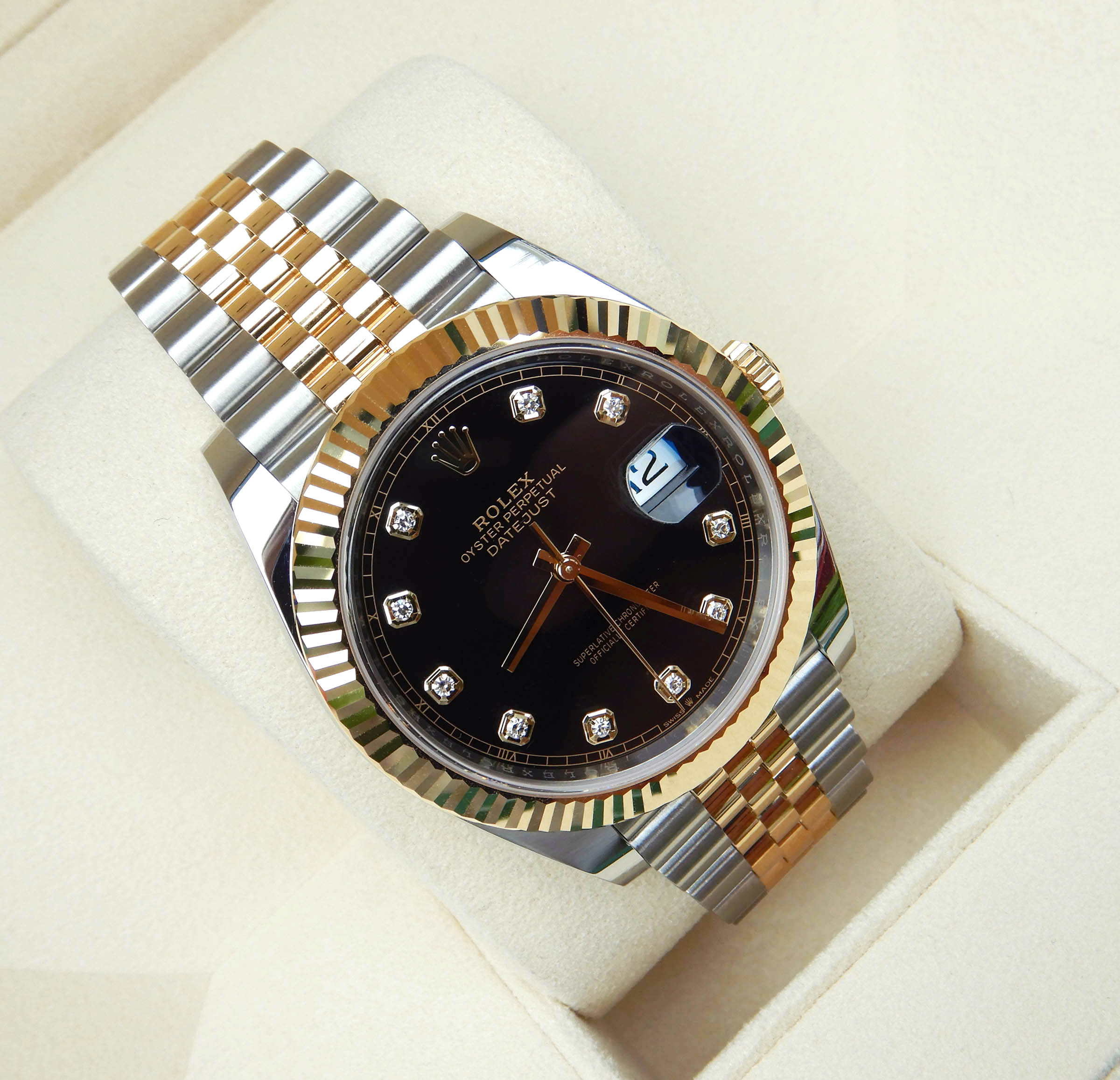 18K 옐로골드 소재의 다이아몬드가 세팅된 고급스러운 분위기를 지닌 롤렉스 데이저스트 41 126333 입니다.