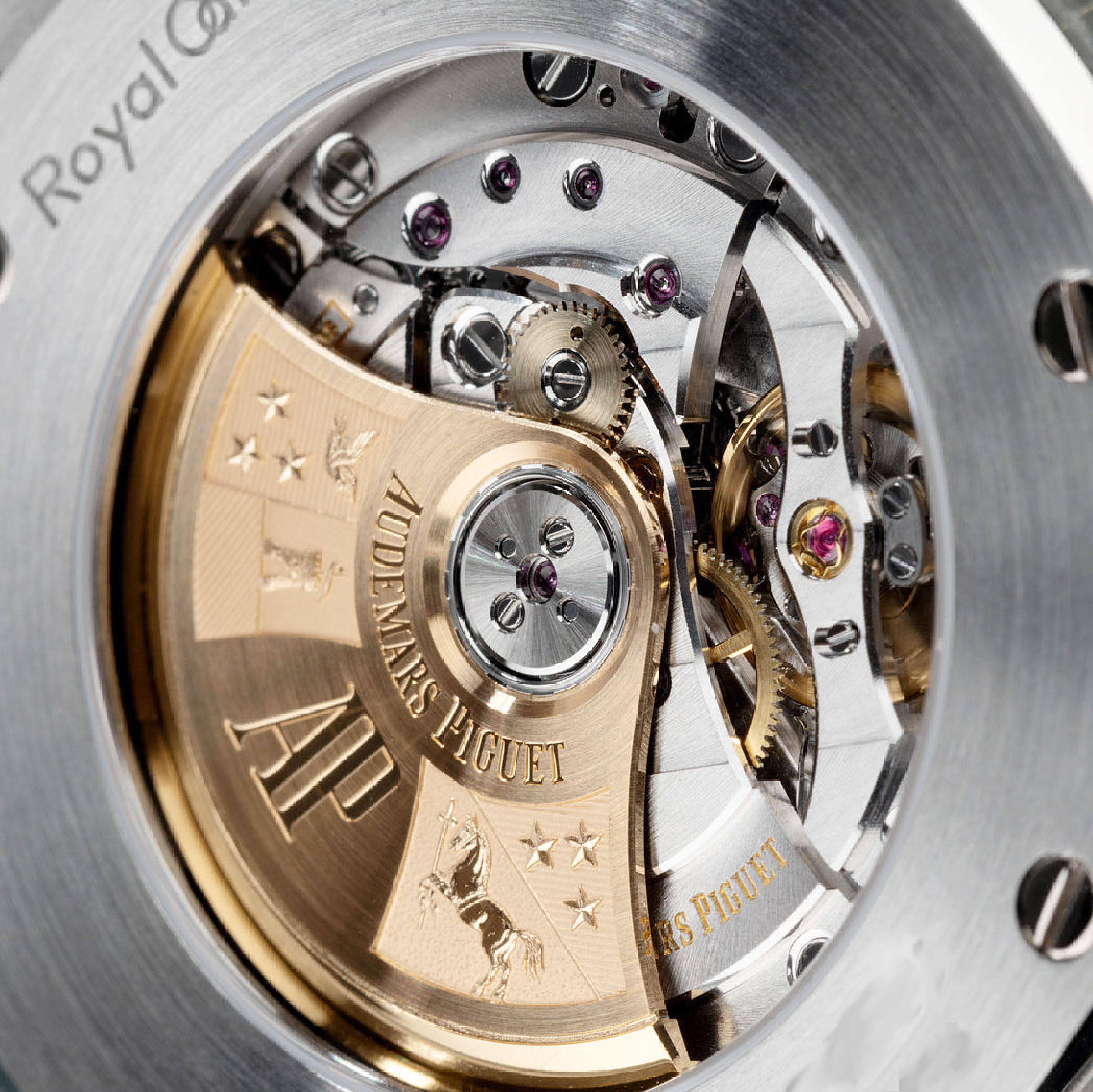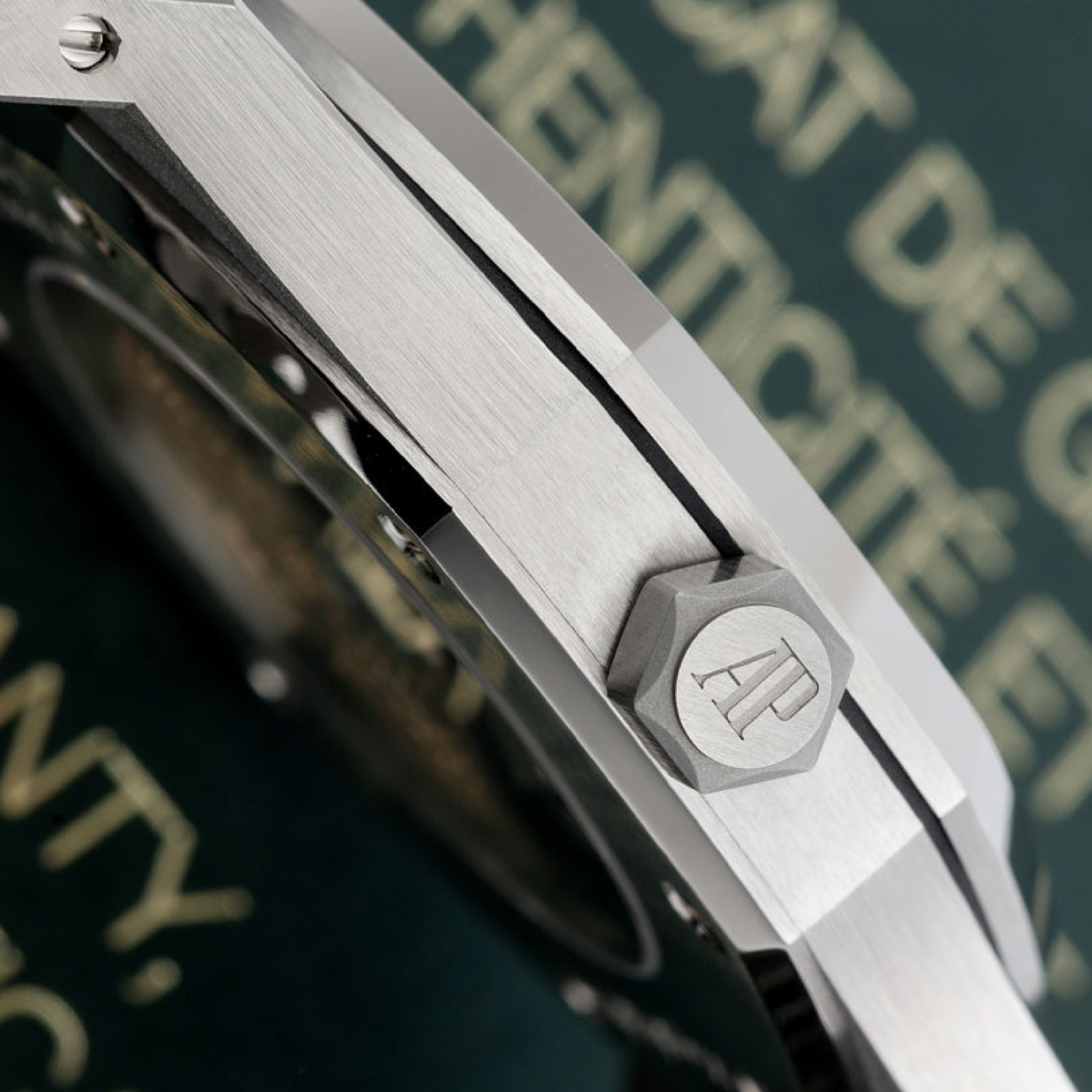 블루 다이얼과 스틸 소재의 아이코닉한 디자인이 특징인 오데마피게 로얄오크 15400ST 모델 입니다.3시방향 데이트창과 화이트골드 소재의 바 인덱스 시각표시, 어두운곳에서의 가독성을 위해 야광처리 되어있습니다.기본적으로 수심 50m 방수기능을 보장하며, 스크래치 방지 사파이어글래스가 세팅되었습니다.케이스 백은 스켈레톤으로 구성되어 3120 칼리버의 움직임을 실시간으로 볼 수 있으며, 약 60시간의 파워리저브 기능을 제공합니다.오데마피게 로얄오크 모델의 가장 큰 특징인 팔각형 베젤과 고유한 패턴의 태피스리 블루다이얼로 시선을 사로잡으며,심플하면서도 인기있는 블루 다이얼의 디자인으로 비즈니스, 사무용으로도 착용하시기 좋은 모델입니다.2012년 최초 출시되어 상당한 인기얻었던 모델로 현재는 단종되어 찾아보기 힘든 모델입니다.오데마피게 로얄오크 15400ST 모델은 예약후 빅펀샵 오프라인 매장에서 구입이 가능합니다.