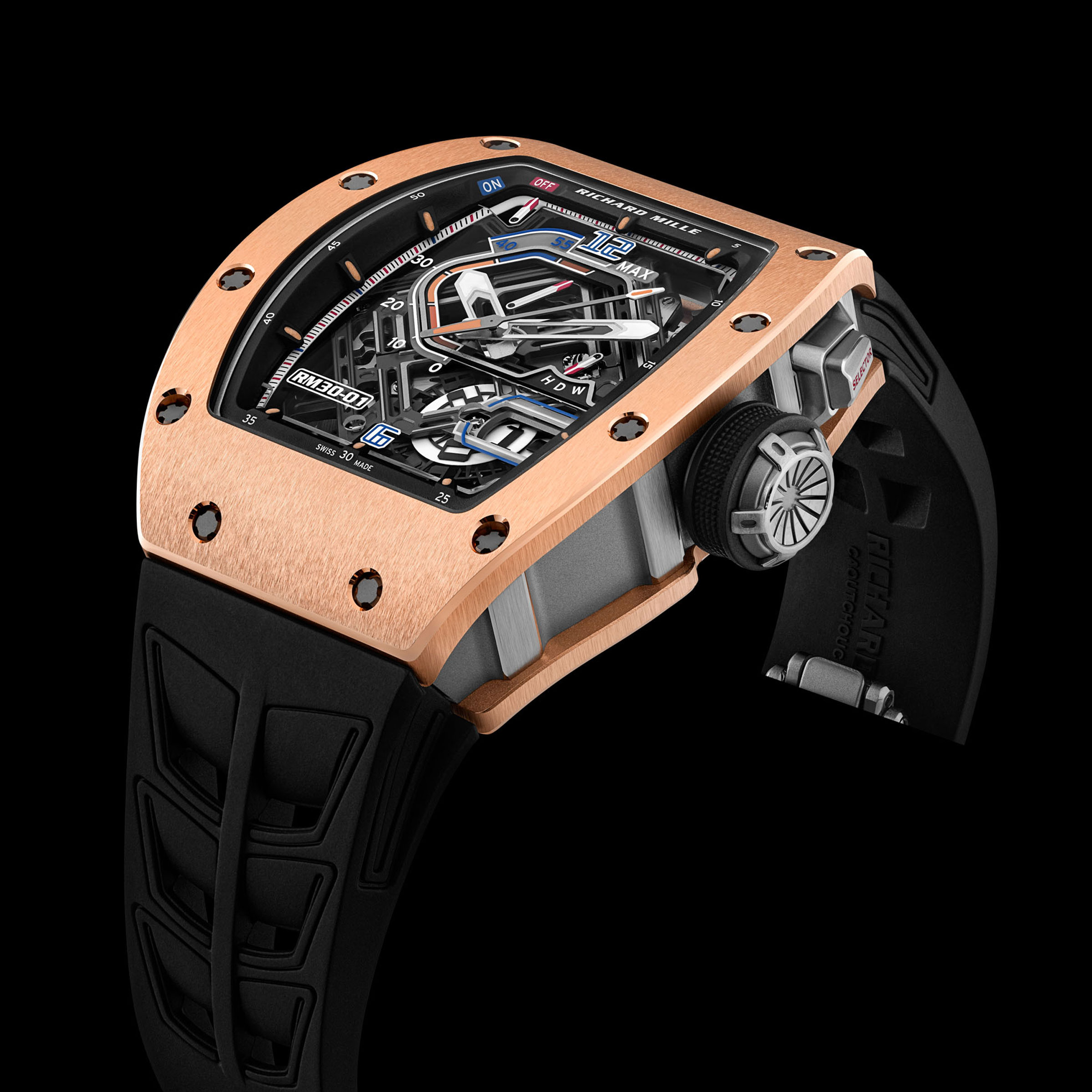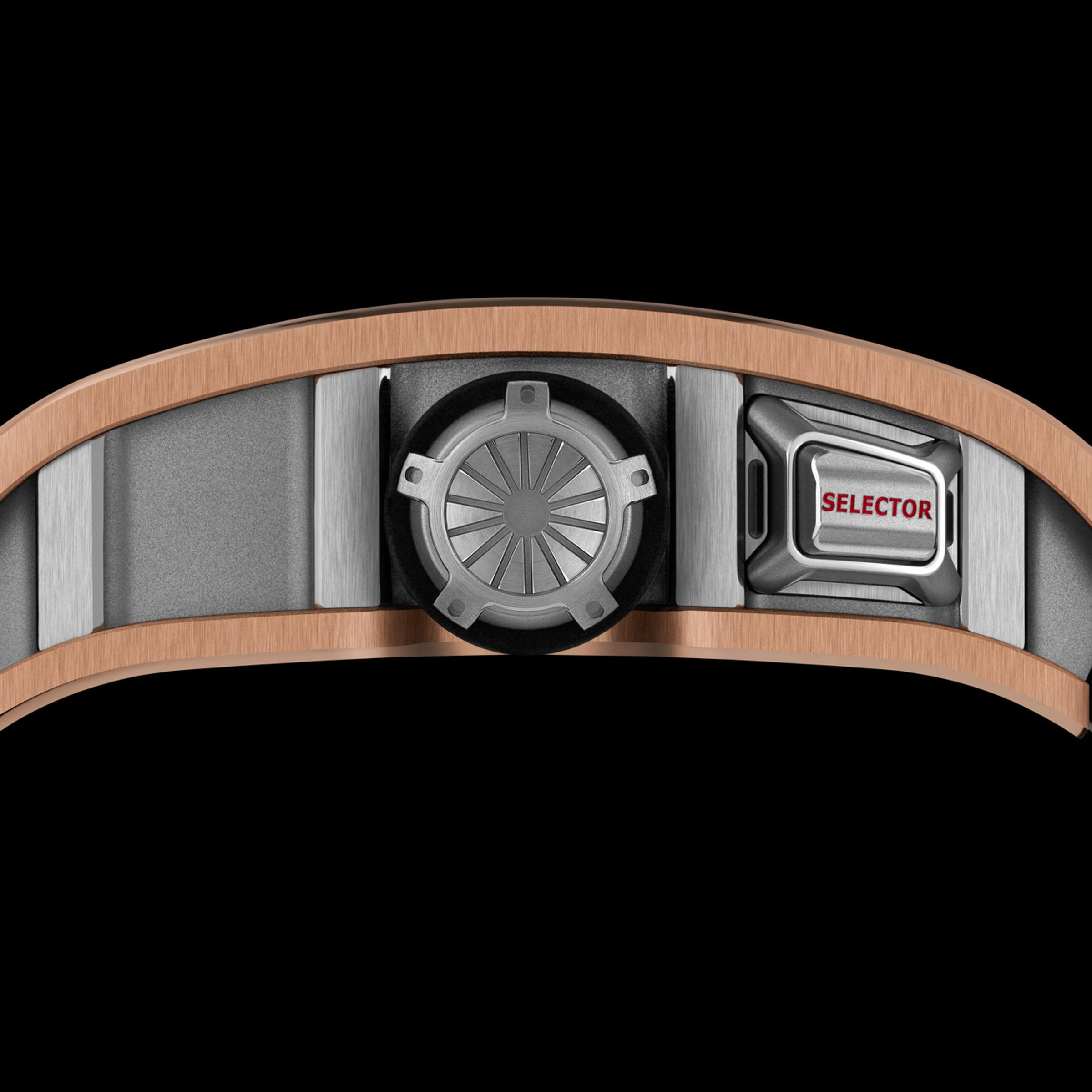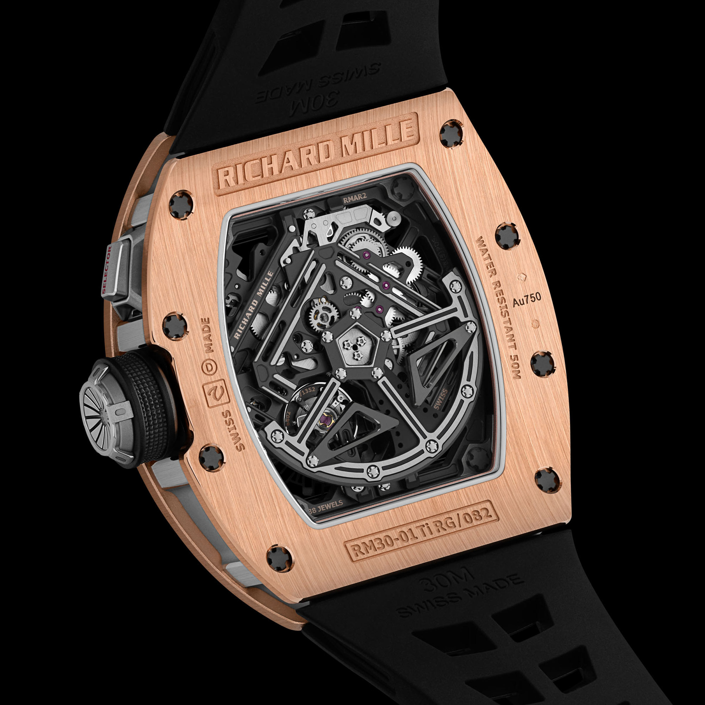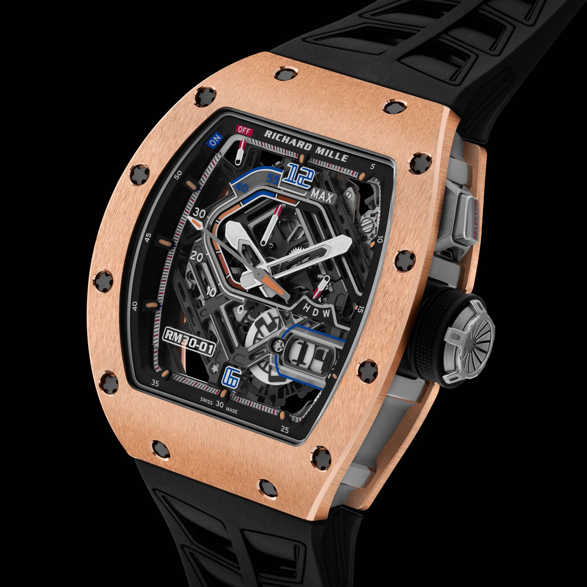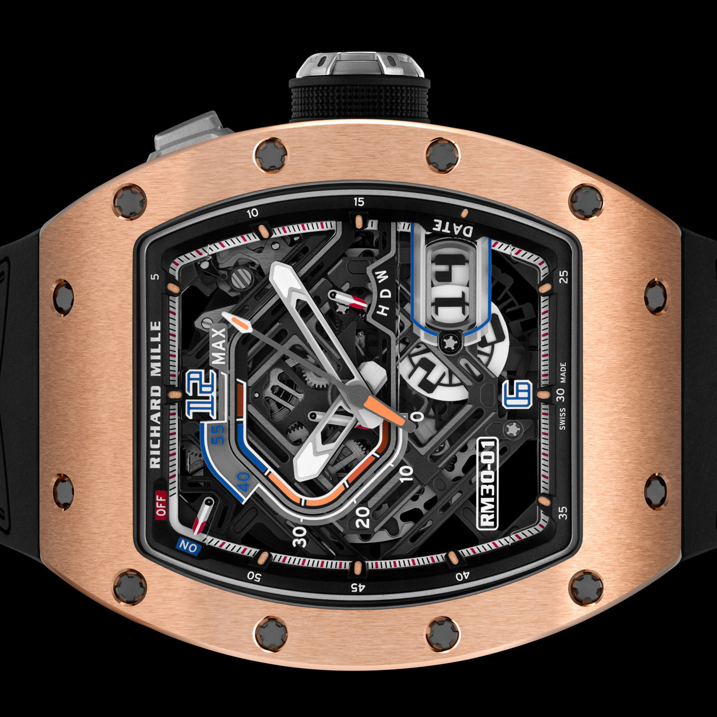레드 골드 소재의 케이스와 스켈레톤 다이얼이 돋보이는 리차드밀 RM 30-01 모델입니다.케이스 직경 크기는 42mm x 50mm 로 톤노 형태의 케이스 모양을 지닌 모델입니다.케이스는 전체 새틴 마감, 마이크로블라스팅 및 폴리싱 처리된 티타늄 소재로 인체공학적 디자인이 특징이며,3중 구조의 케이스는 2개의 니트릴 O-링 씰을 통해 약 수심 50m 방수기능을 제공합니다.무브먼트는 리차드밀 RMAR2 칼리버가 사용되었으며, 약 55시간의 파워리저브 기능을 보장합니다.파워리저브가 55시간에 도달하면, 로터가 자동으로 풀리며, 와인딩의 무리를 줄이며,반대로 파워리저브가 40시간 미만으로 감소하면, 자동으로 클러치 되는 기능이 포함된 디클러처블 로터가 사용되었습니다.파워리저브의 시간은 9시부터~12시 방향의 컬러 브릿지 게이지와 세컨즈 핸즈로 표시됩니다.리차드밀 RM 30-01 모델은 자동차의 기어박스와 유사하게, 2시 방향에 위치한 푸시 버튼을 한 번만 누르면,와인딩, 날짜 설정, 바늘 설정 기능을 선택할 수 있으며, 3시 방향의 바늘은 선택된 기능을 표시합니다.스켈레톤 다이얼의 베이스 플레이트와 브릿지는 티타늄 합금으로 제작되어 유동적이고 원할한 작동을 보장하며,매우 낮은 무게와 높은 저항 비율로 리차드밀의 엄격한 요건에 맞는 검증 테스트를 거쳐 제작됩니다.리차드밀 RM 30-01 모델은 예약후 빅펀샵 오프라인 매장에서 구입이 가능합니다.