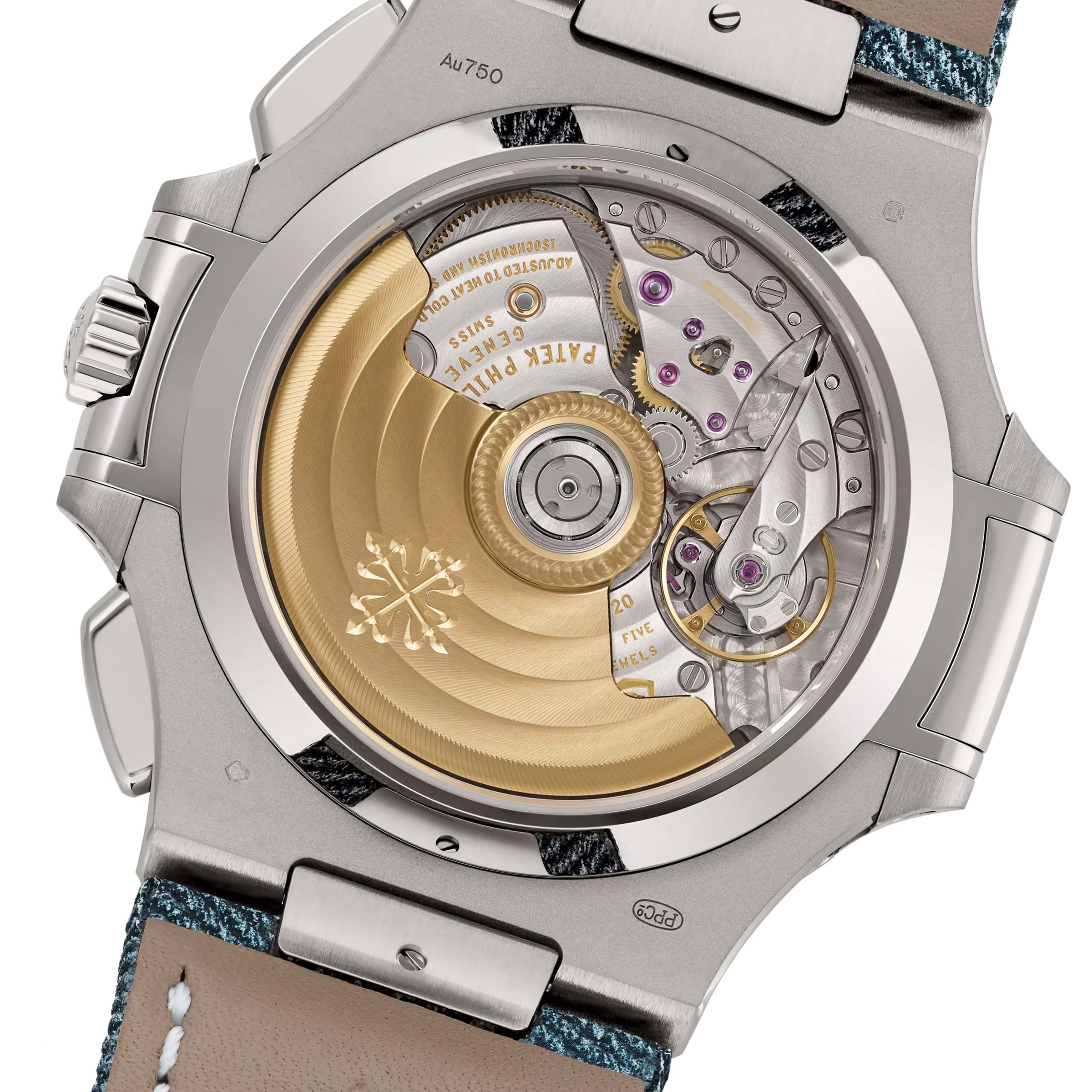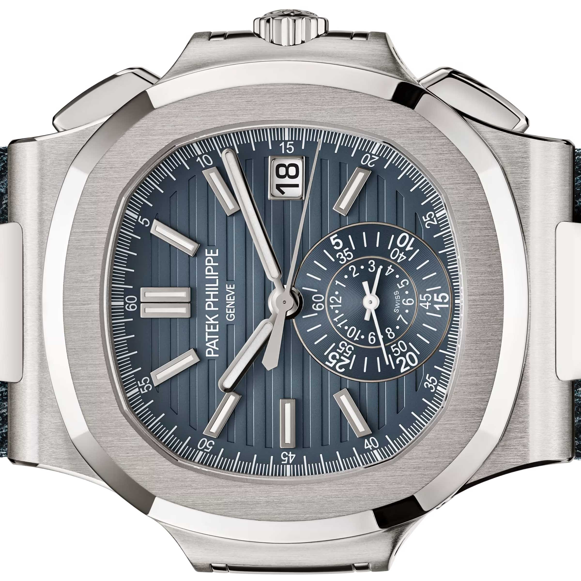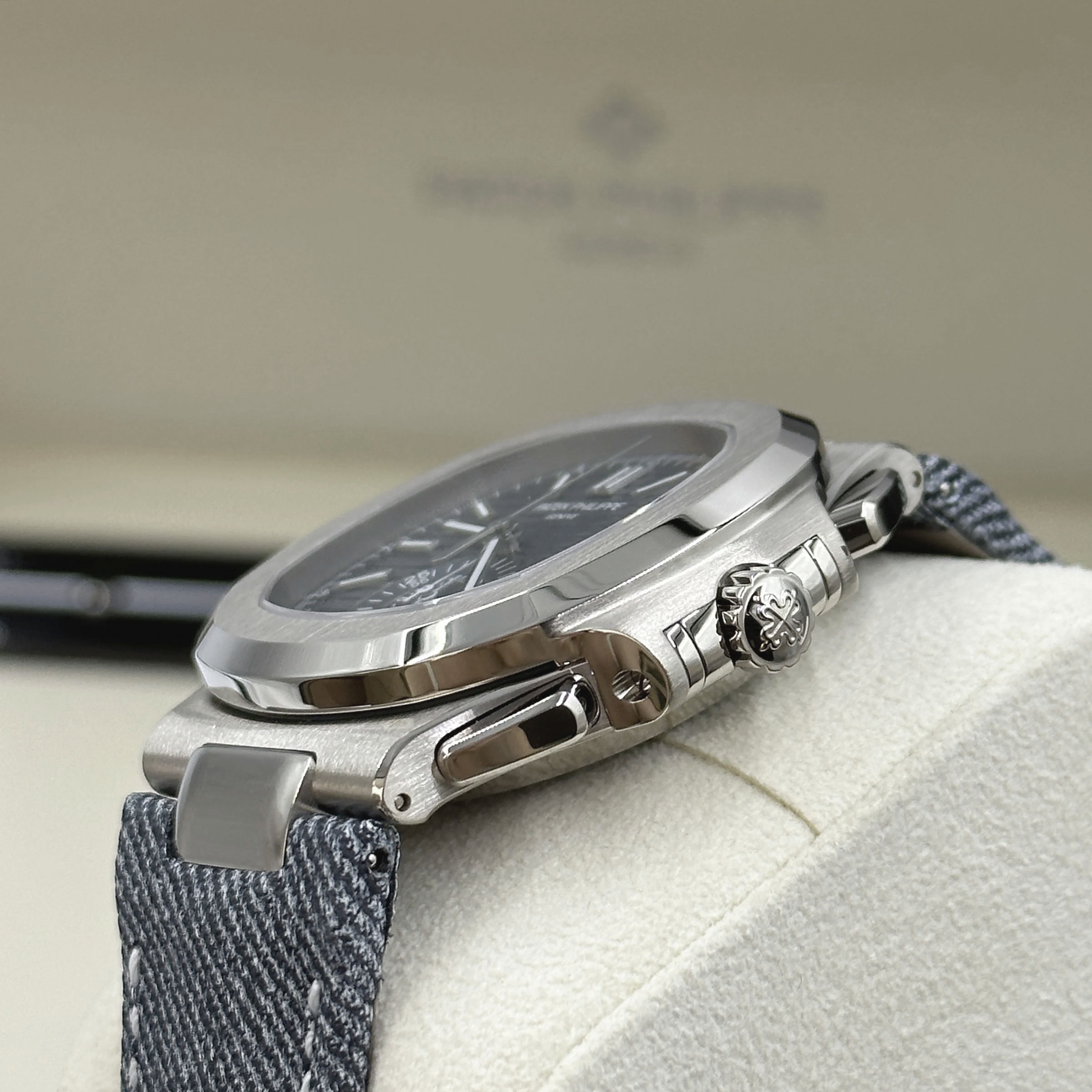 오팔빛이 감도는 블루 그레이 다이얼의 신형 파텍필립 노틸러스 5980/60G-001 모델입니다.2024년 와치스앤원더스에 최초 공개되었으며, 직경 40.5mm의 18K 화이트 골드 케이스와오팔린 블루 그레이 다이얼, 가로로 양각 처리된 바 인덱스와 정중앙 크로노그래프 다이얼이 특징입니다.특별히 스트랩은 데님 패턴 송아지 가죽 스트랩이 세팅되어, 스포티하면서도 고급스러운 분위기를 동시에 갖추었으며,무브먼트는 CH 28-520 C 무브먼트가 세팅되어, 약 55시간의 파워리저브 기능과 30m 방수기능을 제공합니다.기본적인 사용 방법은 다른 모델들과 동일하게 크라운을 통해 시간과 데이트 창을 조정할 수 있습니다.크로노그래프 기능은 2시 방향의 버튼을 눌러 시작과 정지를 할 수 있으며, 4시 방향 버튼은 시간 측정값 리셋과플라이백 기능을 지원해 측정 중에도 즉시 초기화 후 다시 시간 측정을 시작할 수 있습니다.또한, 7시 방향에 위치한 히든 버튼을 통해 날짜를 하루씩 조정할 수 있는 퀵 코렉터 기능을 지원합니다.파텍필립 노틸러스 5980/60G-001 모델은 예약후 빅펀샵 오프라인 매장에서 상담 및 구입이 가능합니다.