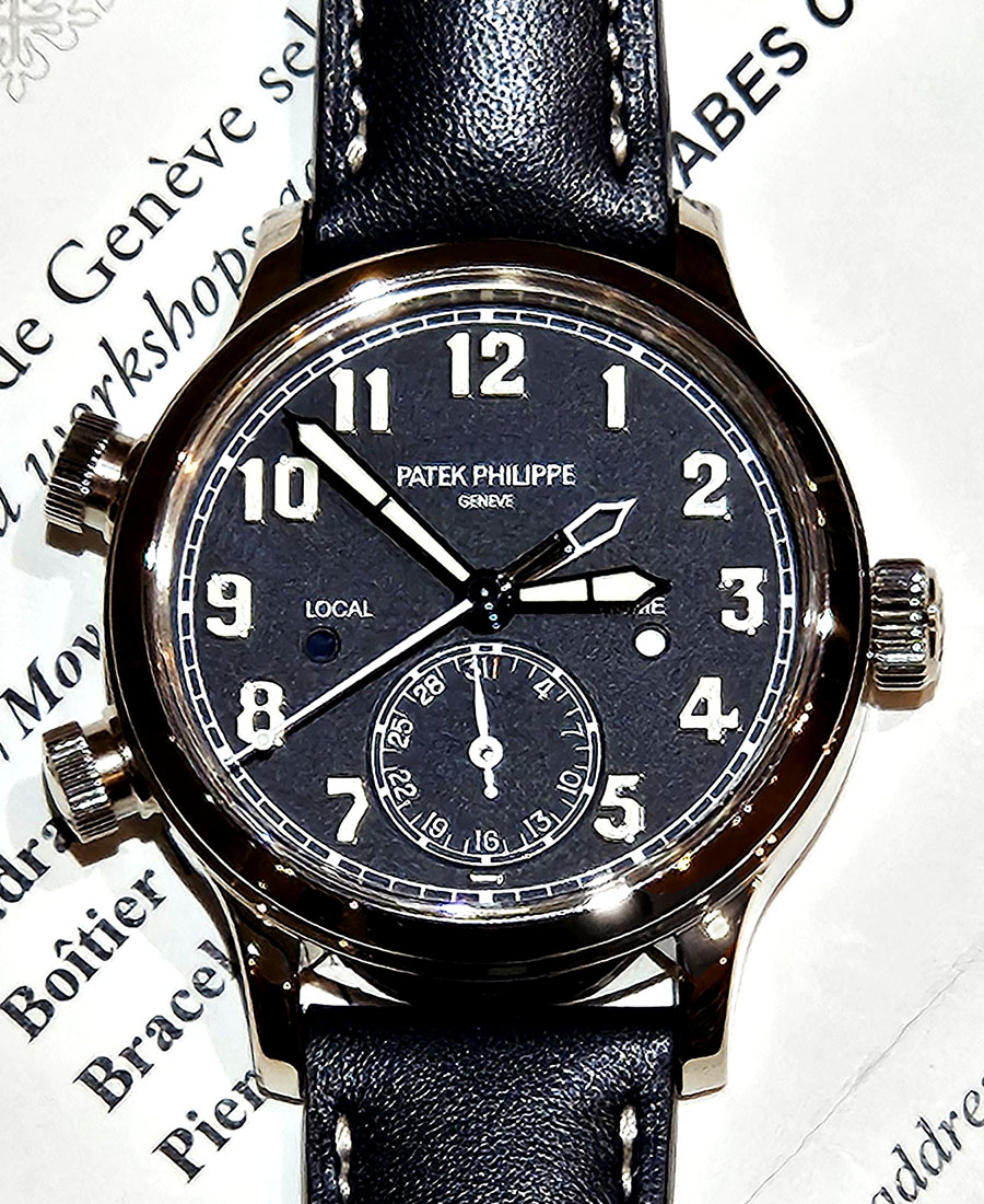 조종사 시계에서 영감을 받은 블루 래커 다이얼의 파텍필립 칼라트라바 파일럿 트래블 타임 입니다.블루 래커 다이얼은 흰색 발광 코팅이 채워진 화이트 골드 숫자와 블루드 화이트 골드로 만든넓은 발광 바톤 핸즈 덕분에 어둠속에서도 가독성이 매우 훌륭합니다.파텍필립 칼라트라바 파일럿 트래블 타임의 무브먼트는 324 SC FUS 무브먼트가 사용되었으며,294개의 부품으로 구성되어, 세컨드 타임을 표시하는데 매우 편리한 트래블 타임 기능을 제공합니다.파워리저브는 약 45시간을 보장하며, 최대 60m 방수기능을 제공합니다.왼쪽 케이스 측면에 있는 두개의 푸셔로 트래블 타임기능을 사용할 수 있으며,위쪽 푸셔는 반시계반향으로 1시간, 아랫쪽 푸셔는 시계방향으로 1시간씩 이동합니다.로컬시간과 홈시간 두가지 시간 설정이 가능하며, 6시방향의 다이얼은 3일단위의 날짜 다이얼을 표시합니다.예약후 빅펀샵 오프라인 매장에서 상담 및 구입이 가능한 실물사진입니다.