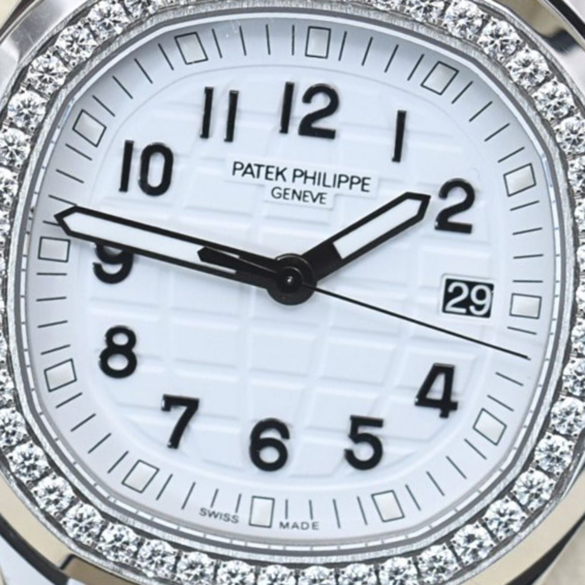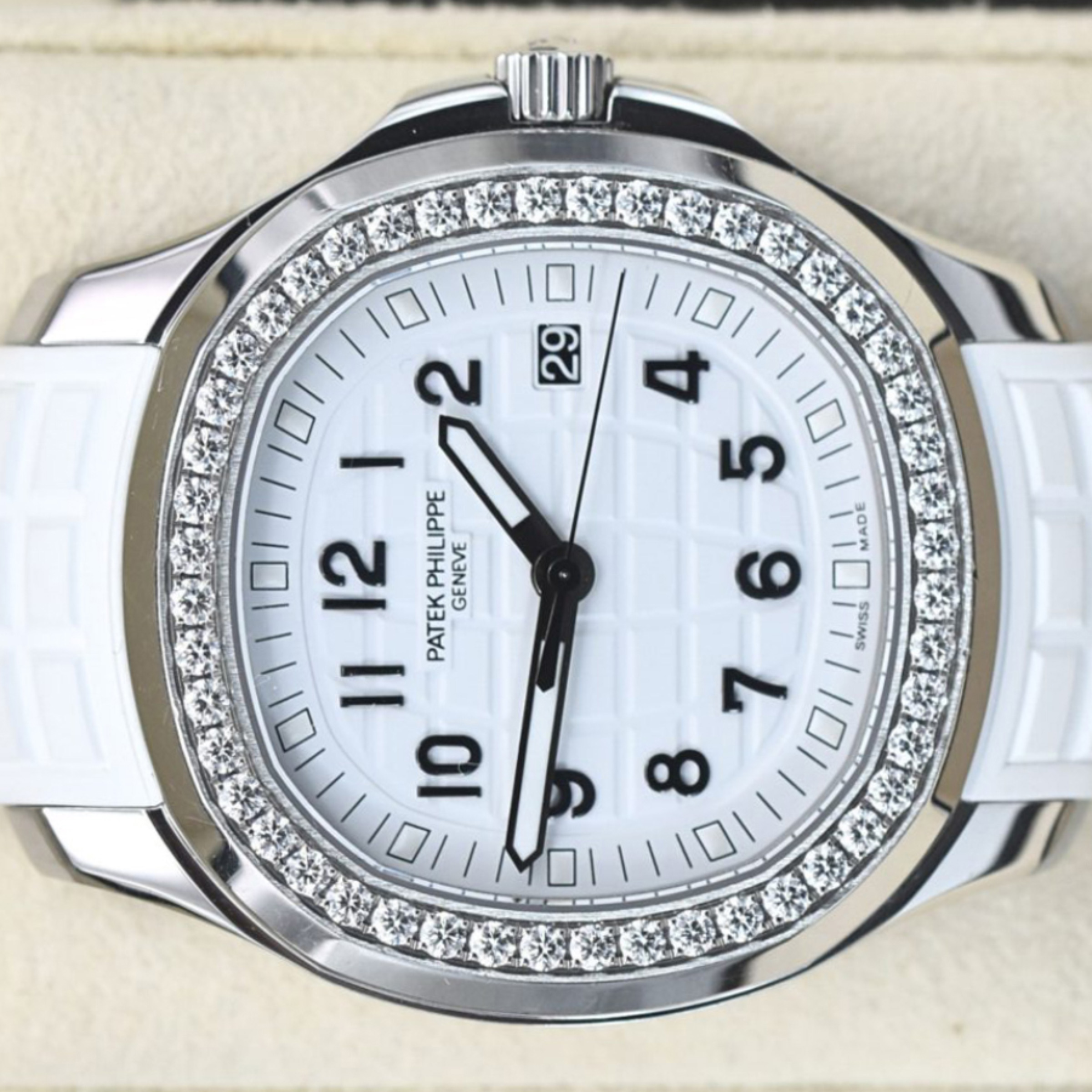 새하얀 눈 처럼 아름다운 38.8mm 사이즈의 아쿠아넛 루체 5267/200A-010 입니다.스테인리스 스틸 소재로 완성되어 2021년에 출시된 파텍필립 아쿠아넛 루체 컬렉션은여성 스포츠 라인의 아쿠아넛 시리즈로, 아쿠아넛 컬렉션의 시그니처인 체커보드 패턴이 특징이며,인덱스와 시침과 분침 모두 화이트 골드 소재가 사용되었습니다.베젤에는 48개의 라운드 컷 톱 웨셀턴 등급의 다이아몬드가 장식되어 아름다움을 선사합니다.브레이슬릿은 파텍필립 화이트 러버 밴드가 사용되어 편안하고 유연한 손목 착용감을 선사합니다.무브먼트는 파텍필립 칼리버 E23-250SC가 장착되었으며, 수심 100m 방수기능을 제공합니다.파텍필립 아쿠아넛 루체 5267/200A-010은 예약후 빅펀샵 오프라인 매장에서 구입이 가능합니다.