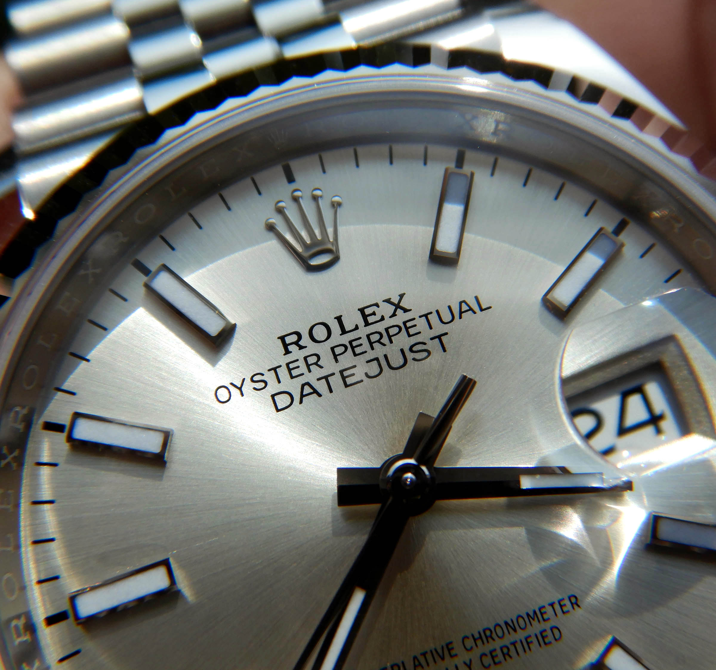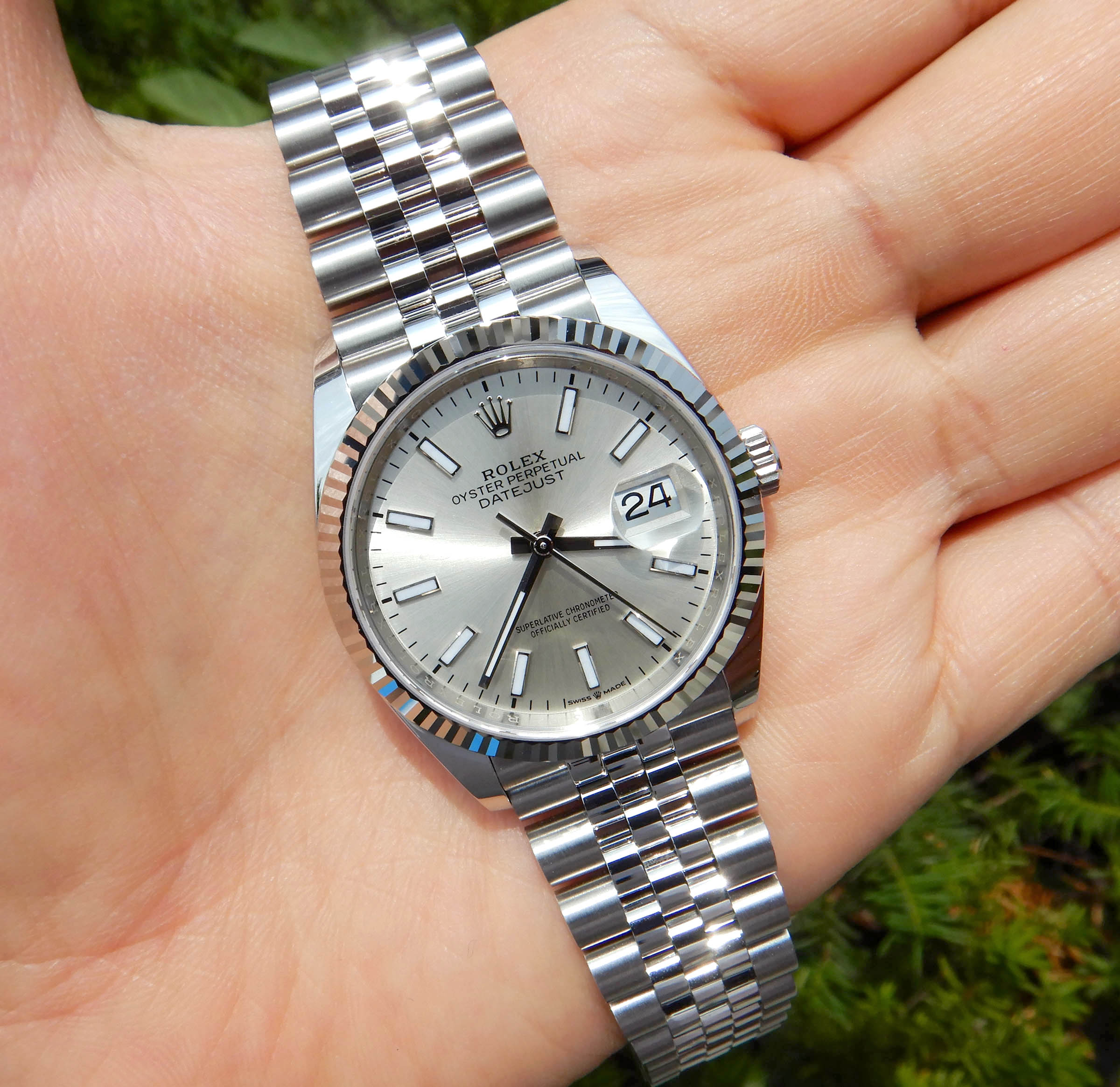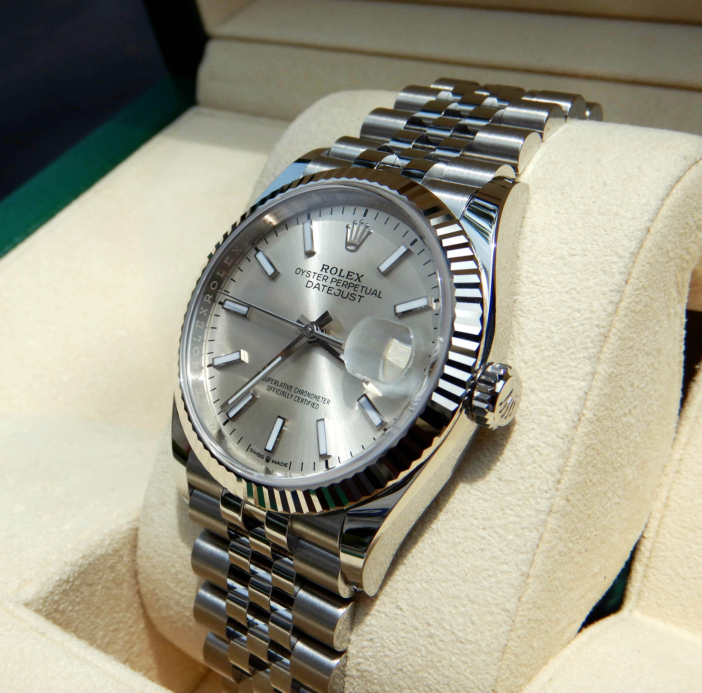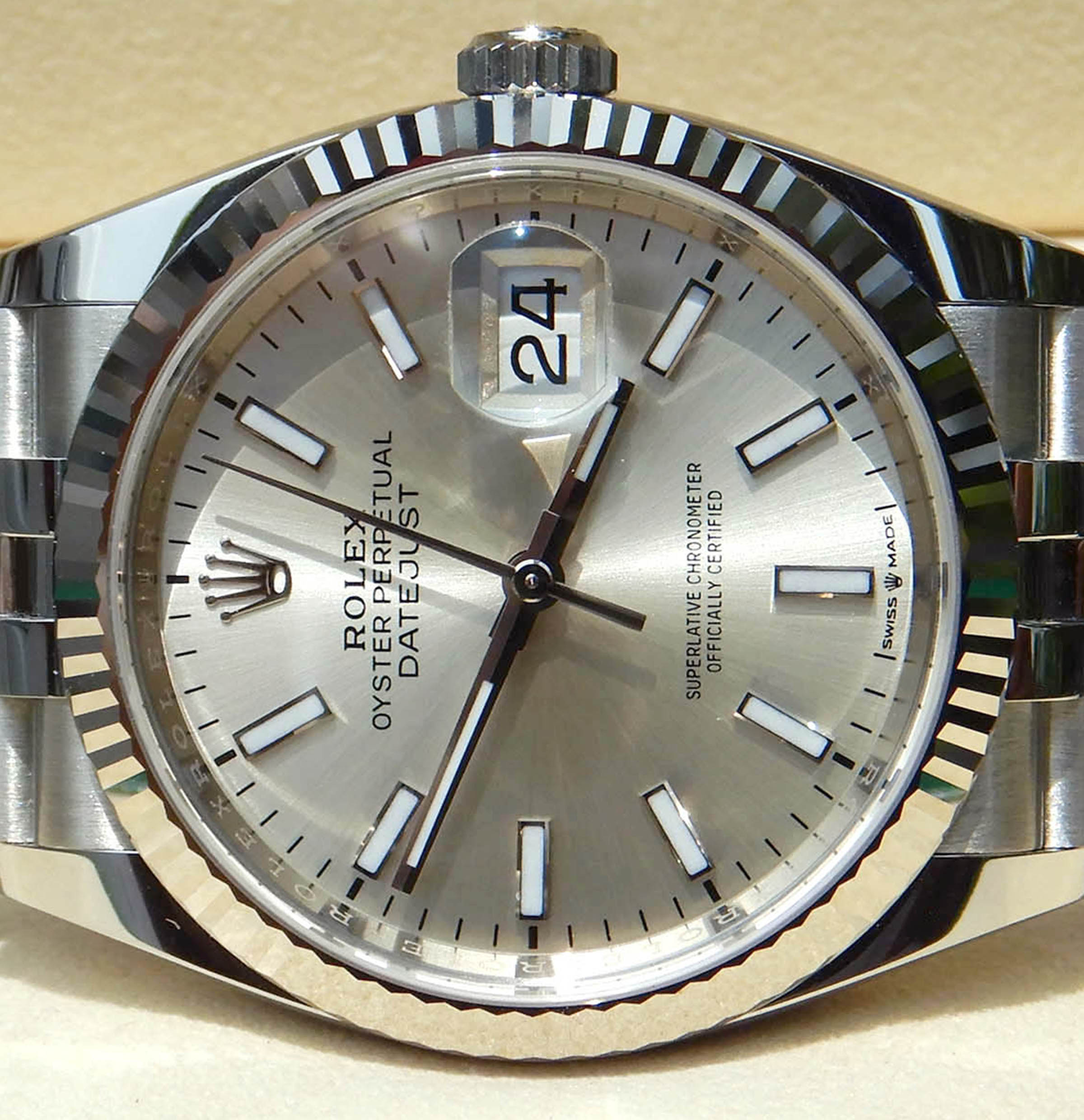 은은한 매력의 실버 다이얼과 18K 화이트골드를 갖춘 롤렉스 데이저스트36 126234 실버 바 인덱스 입니다.