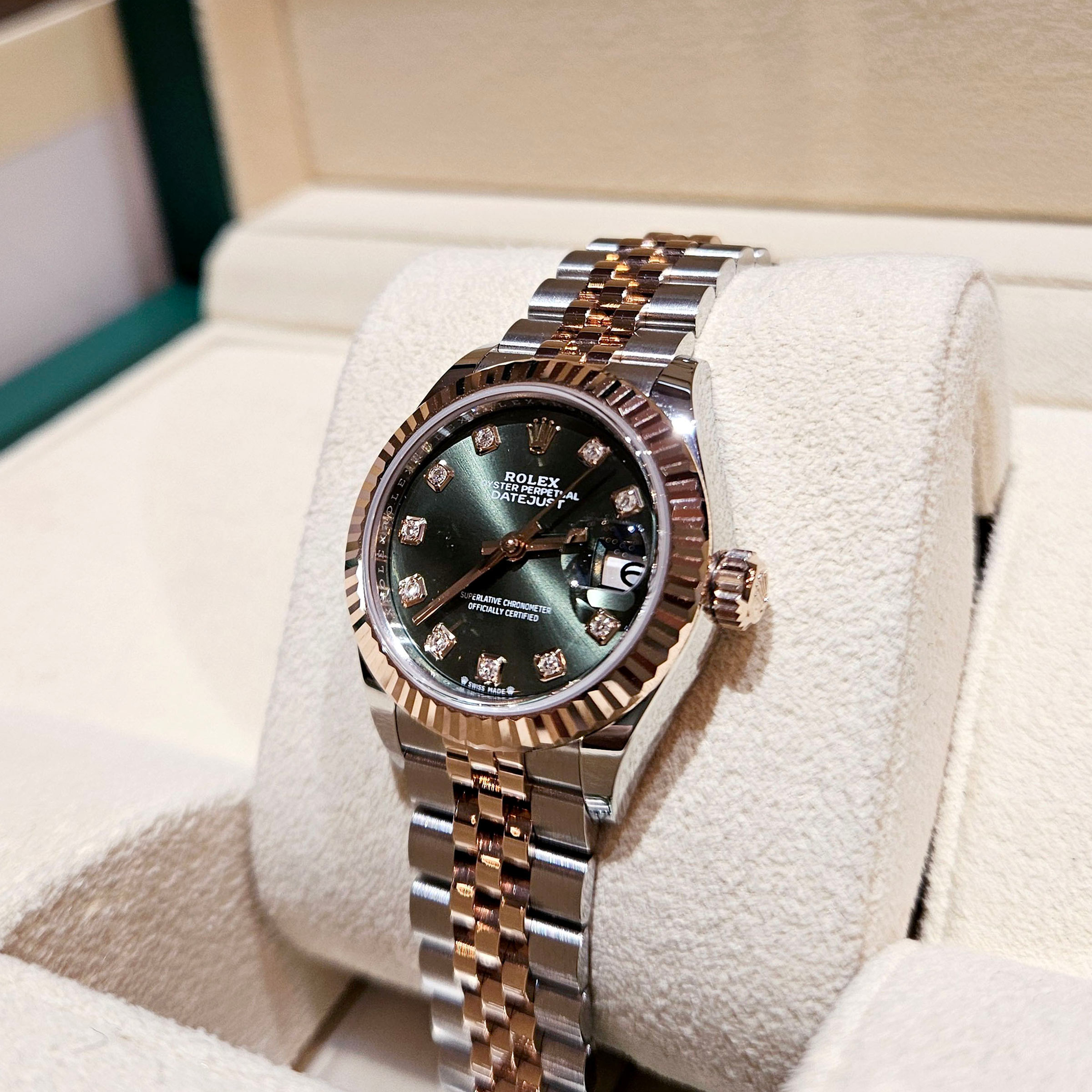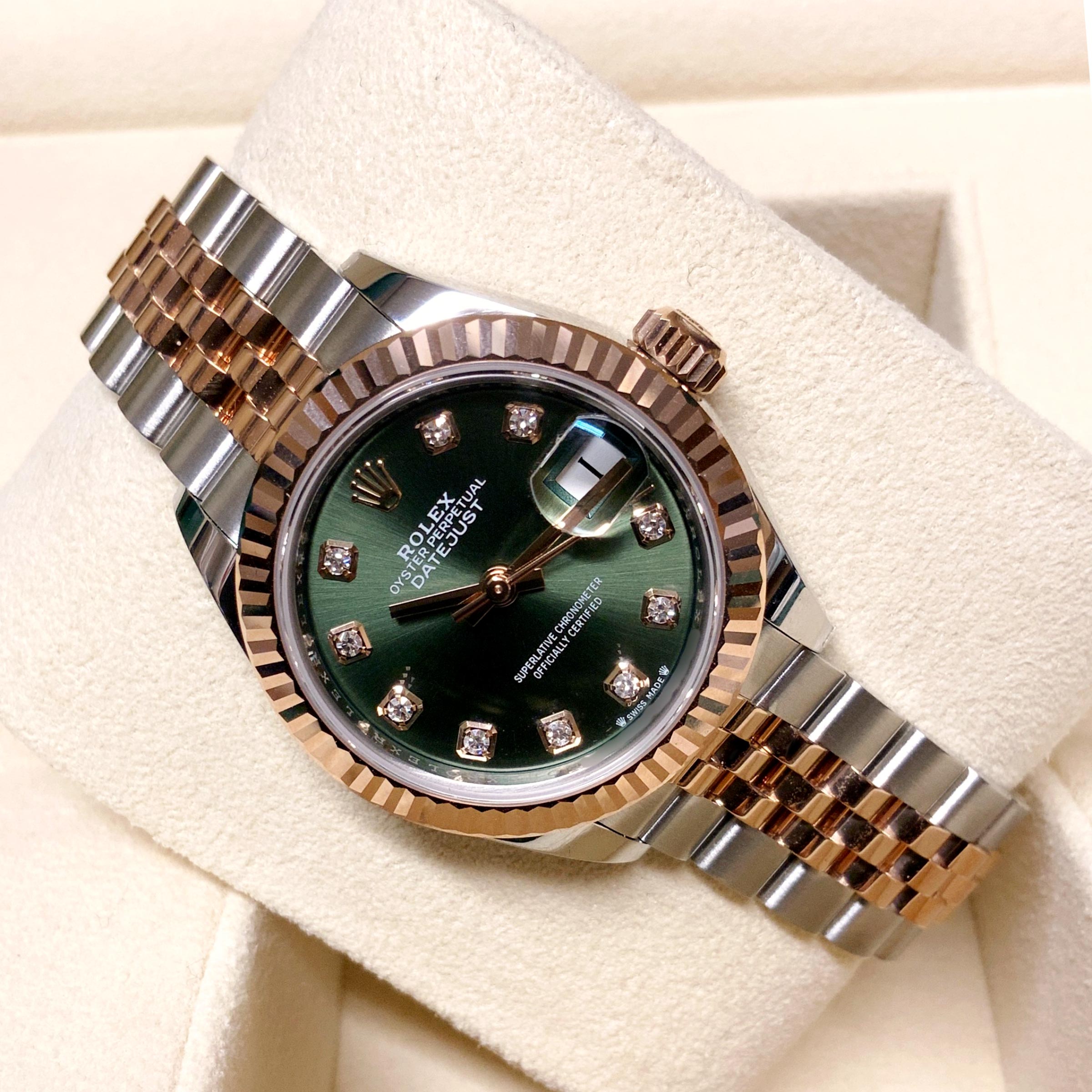 4계절 내내 짙은 녹음의 우아함을 손목에 간직할수 있는 롤렉스 데이저스트28 279171 올리브그린 모델입니다.