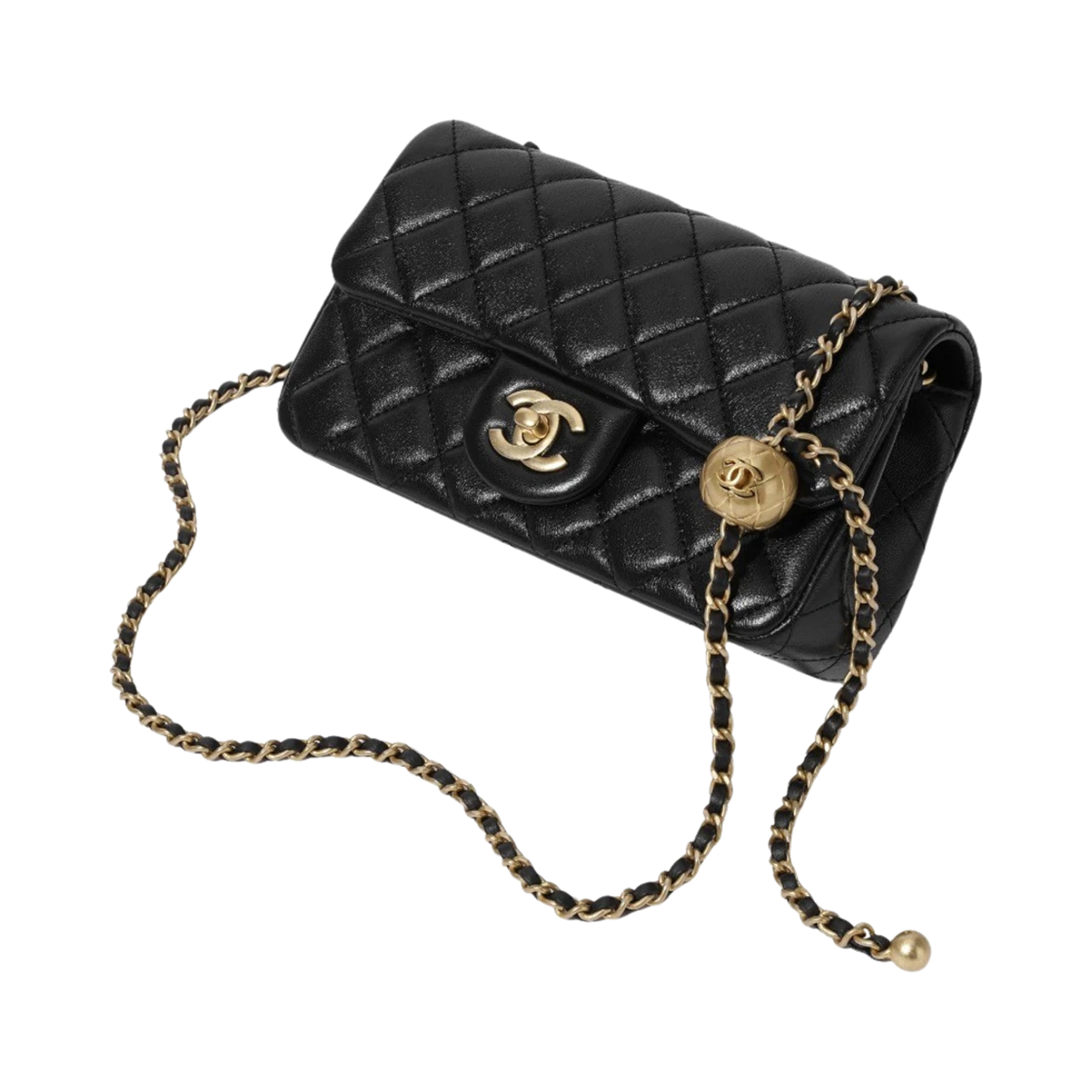 샤넬 로고 골드볼이 돋보이는 샤넬 뉴 미니 골드볼 플랩 백 입니다.전체적인 디자인은 클래식한 퀼팅 패턴의 블랙 램스킨 가죽 소재와 골드볼 디테일이 돋보이며,플랩 백의 뒷면에는 스마일 모양의 서브포켓으로 간편한 수납이 가능합니다.내부 구조는 베이지 색상의 멀티 포켓 형태로 구성되어 있으며, 컴팩트한 수납공간이 특징입니다.메인 스트랩과 연결되어 있는 CC로고 골드볼로 플랩 스트랩의 체인 길이를 조정하실 수 있으며,최대한 길이를 늘렸을때 스트랩 포함 54cm이며, 길이조정으로 숄더백과 크로스백으로도 연출이 가능합니다.샤넬 뉴 미니 골드볼 플랩 백은 예약후 빅펀샵 오프라인 매장에서 구입이 가능합니다.
