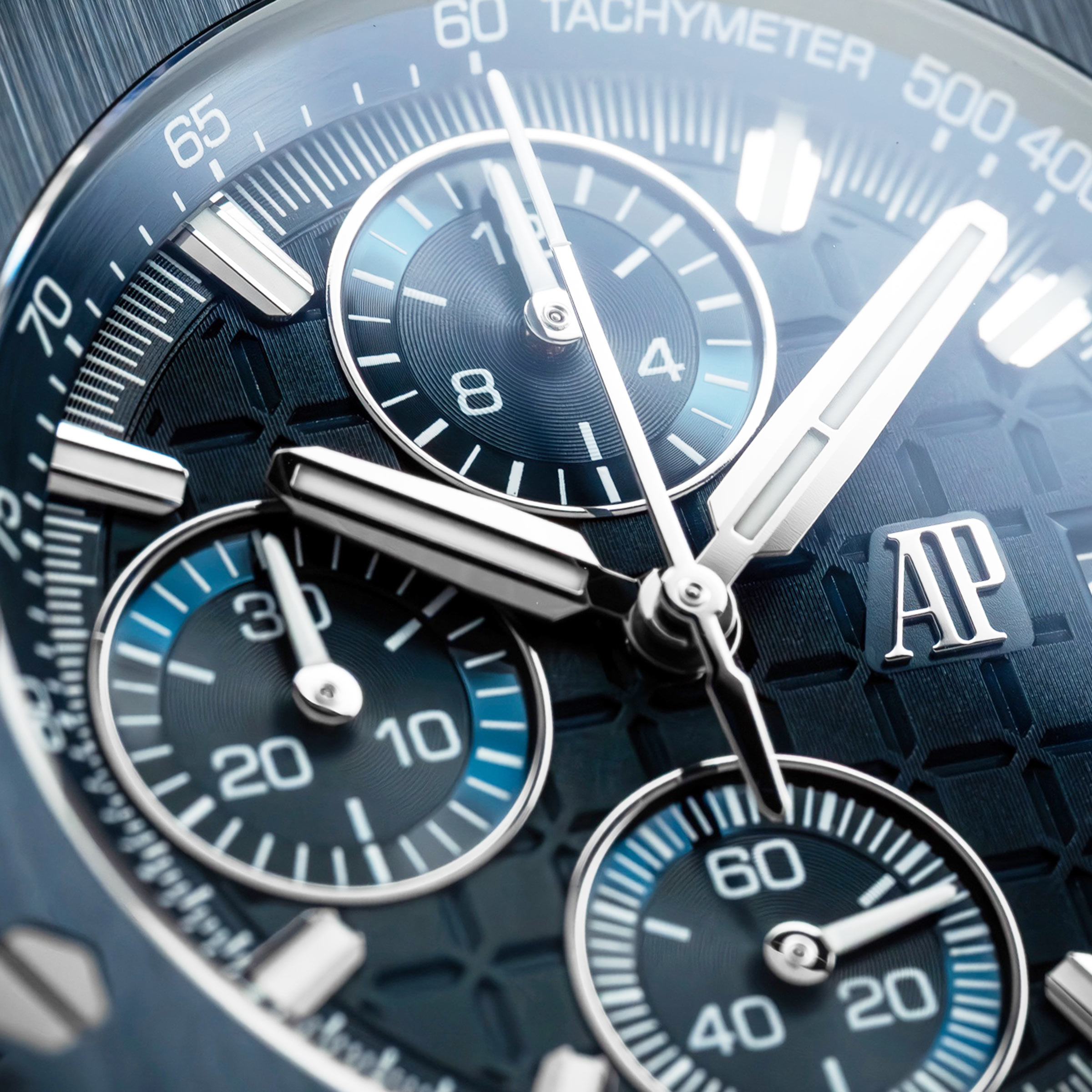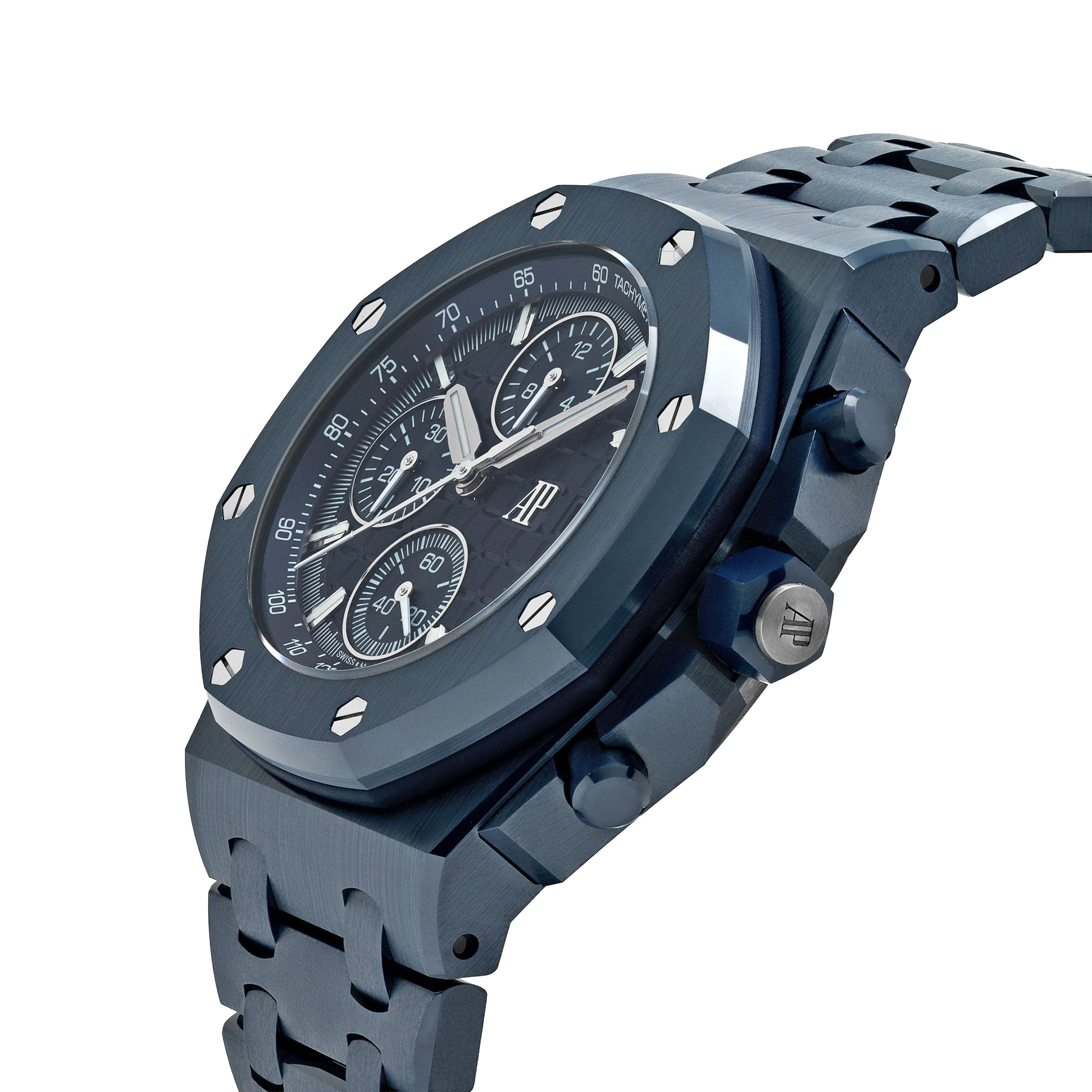 오데마피게 로얄오크 오프셔 26238CD 블루 뉘 누아쥬 50 모델은 나이트 블루 색상의 세라믹 소재가 사용되었습니다.이 특별한 색상은 최초의 로열오크 5402 모델에 적용되었던 다이얼 컬러를 계승하며,42mm의 케이스 직경과 15.3mm에 달하는 두께로 손목위에서 독보적인 존재감을 드러냅니다.착용자의 추향과 개성을 뚜렷하게 표현하는 모델로, 화이트 골드로 제작된 아워 미닛 핸즈와 다이얼의 인덱스는 야광코팅이 적용되어,어두운곳과 밝은곳에서 스타일리시한 가독성이 뛰어나며, 동일한 블루 컬러로 마감된 이너 베젤은 디스플레이를 깊이감있게 표현합니다.내부에는 플라이백 기능과 버티컬 클러치, 컬럼 휠, 약 70시간의 파워리저브가 세팅되었으며, 4404 칼리버가 사용되었습니다.26238CD 모델은 소재 혁신과 오데마피게 제작 기술의 정수를 보여주는 걸작으로 2025년에 최초 출시되어, 새로운 시대를 열어갑니다.오데마피게 로얄오크 오프셔 26238CD 블루 뉘 누아쥬 50 모델은 예약후 빅펀샵 오프라인 매장에서 상담 및 구입이 가능합니다.