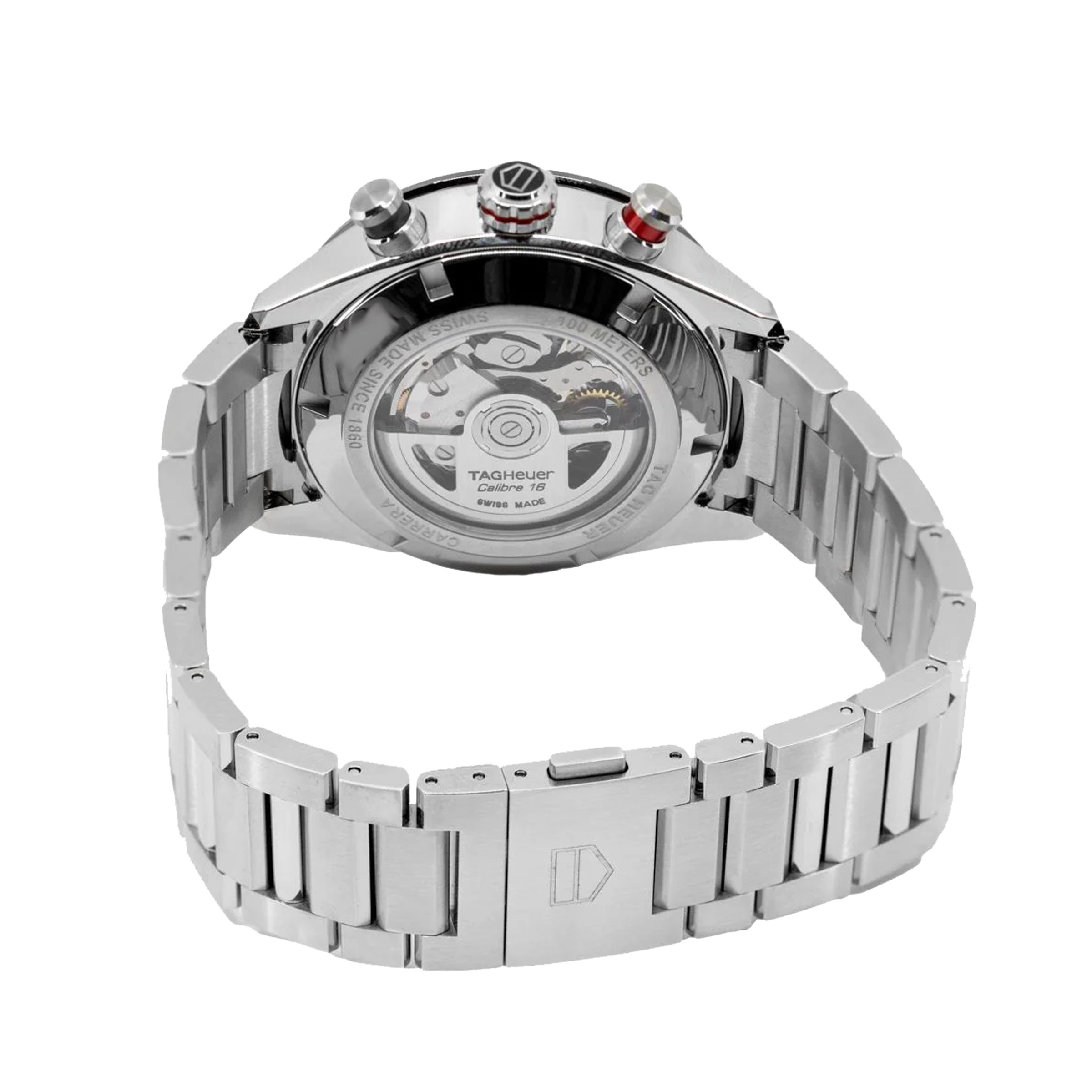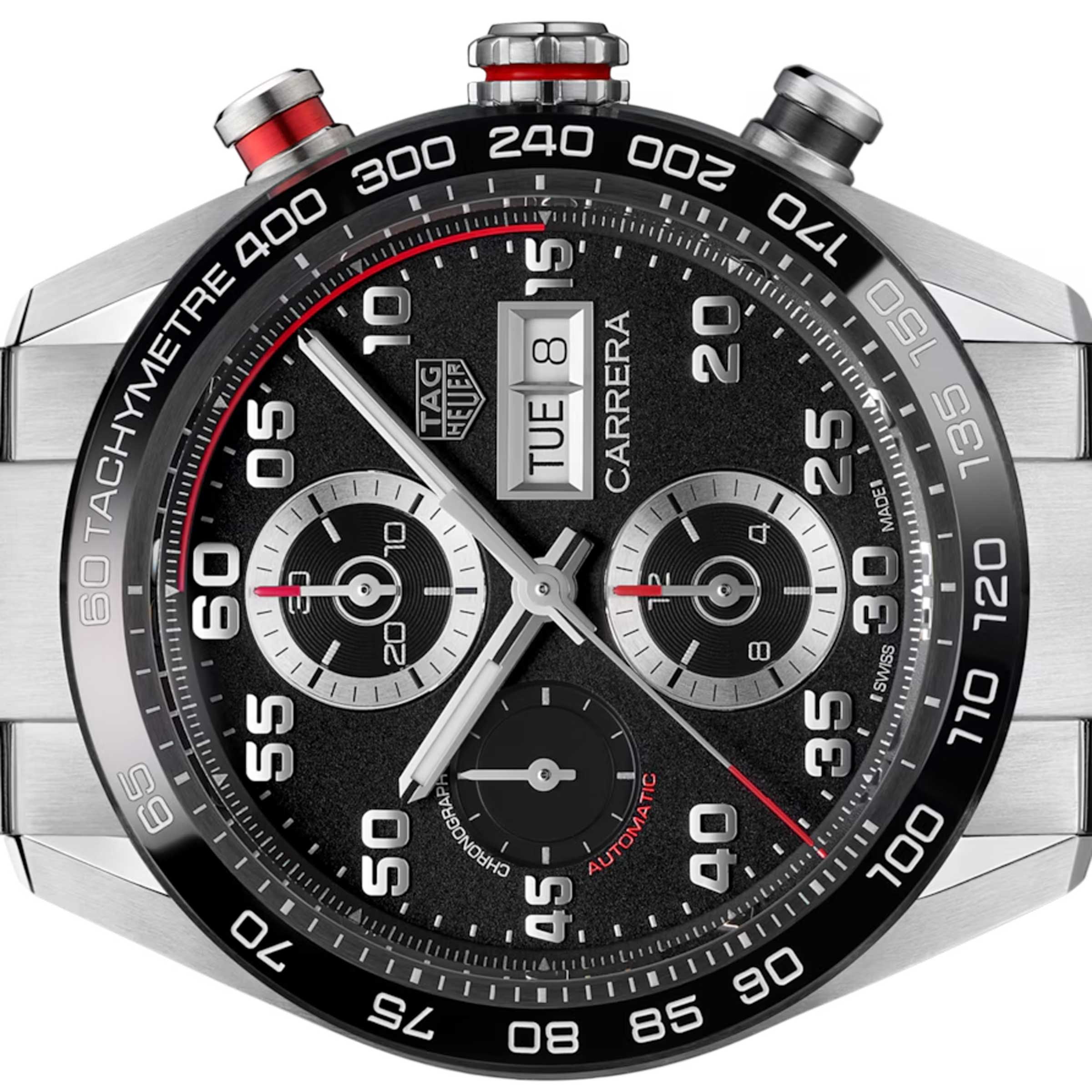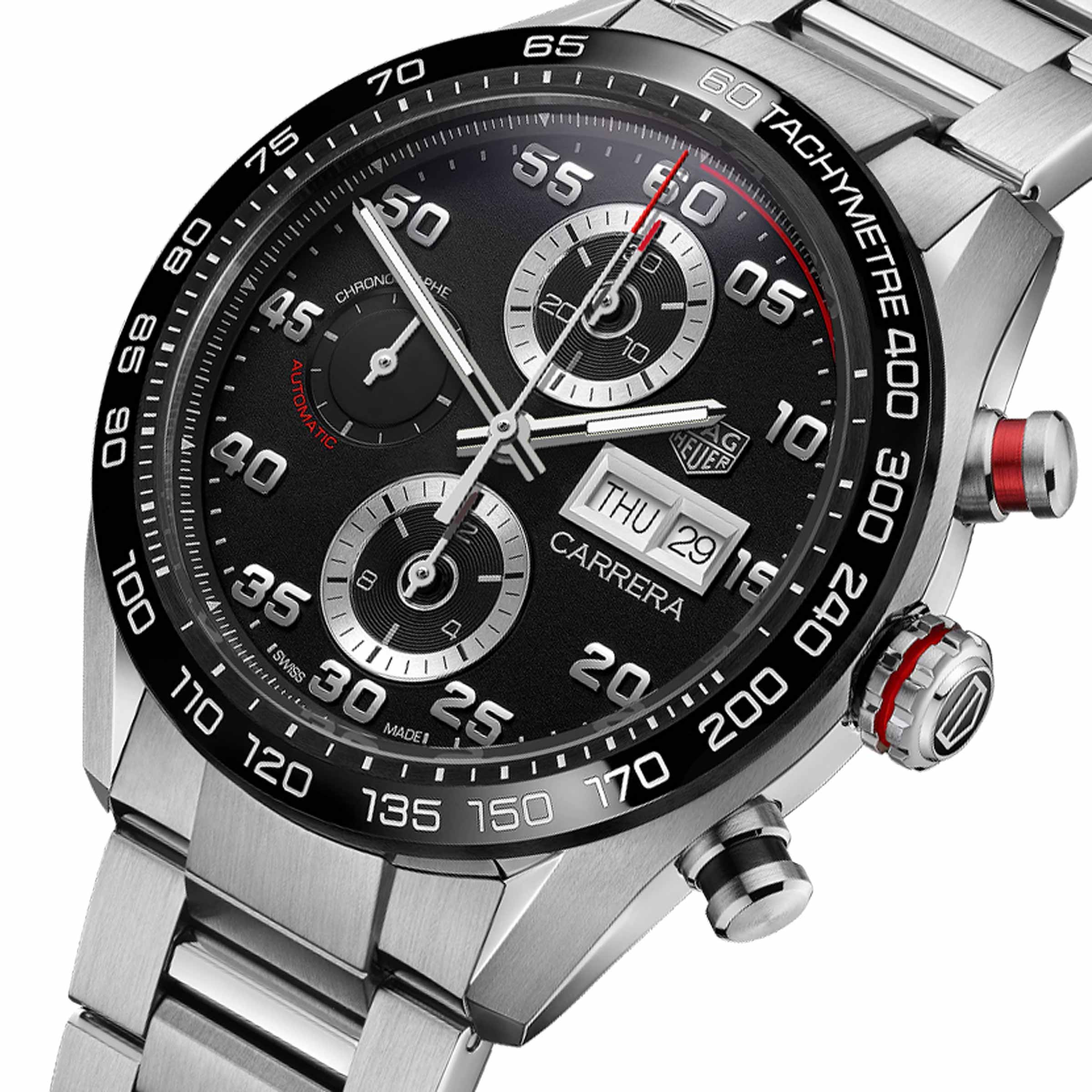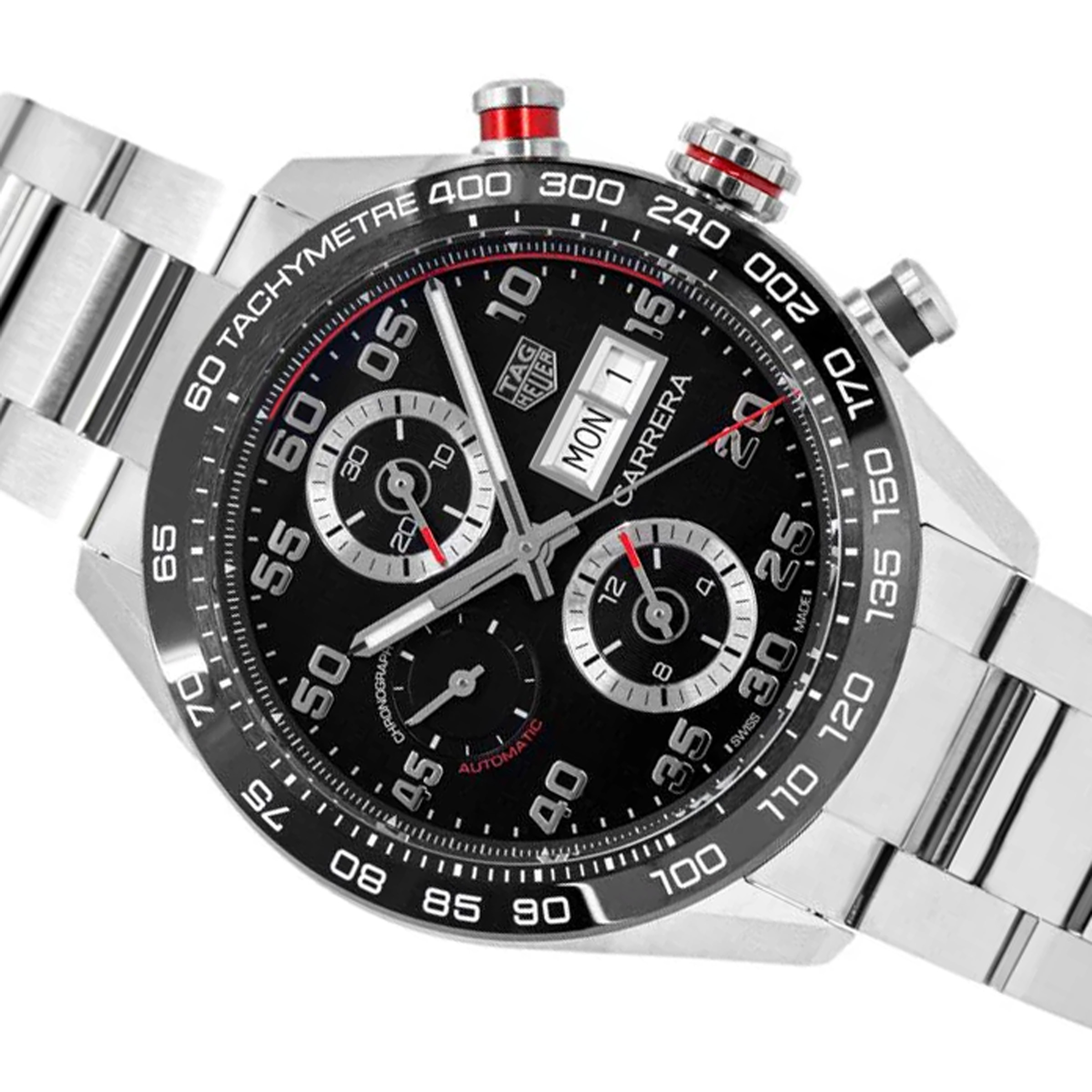 세라믹 베젤과 블랙다이얼이 세팅된, 태그호이어 까레라 크로노그래프 모델입니다.까레라 크로노그래프는 시계와 모터스포츠의 세계를 가장 긴밀하게 잇는 상징적인 아이콘입니다.레드 컬러 포인트와 상징적인 폰트로 새롭게 디자인되었으며, 아이코닉한 까레라에 장착되는스틸 H형 브레이슬릿으로 손목에 자연스럽게 감기는 인체공학적 설계가 특징입니다.돔형 사파이어 글래스를 적용한 모델로 스포티한 매력과 크로노그래프에 깃든 강렬한 매력이 특징입니다.무브먼트는 칼리버 16 오토매틱 무브먼트로 수심 100m 방수기능과 약 42시간의 파워리저브를 제공합니다.태그호이어 까레라 크로노그래프 44mm 모델은 예약후 빅펀샵에서 구입이 가능합니다.